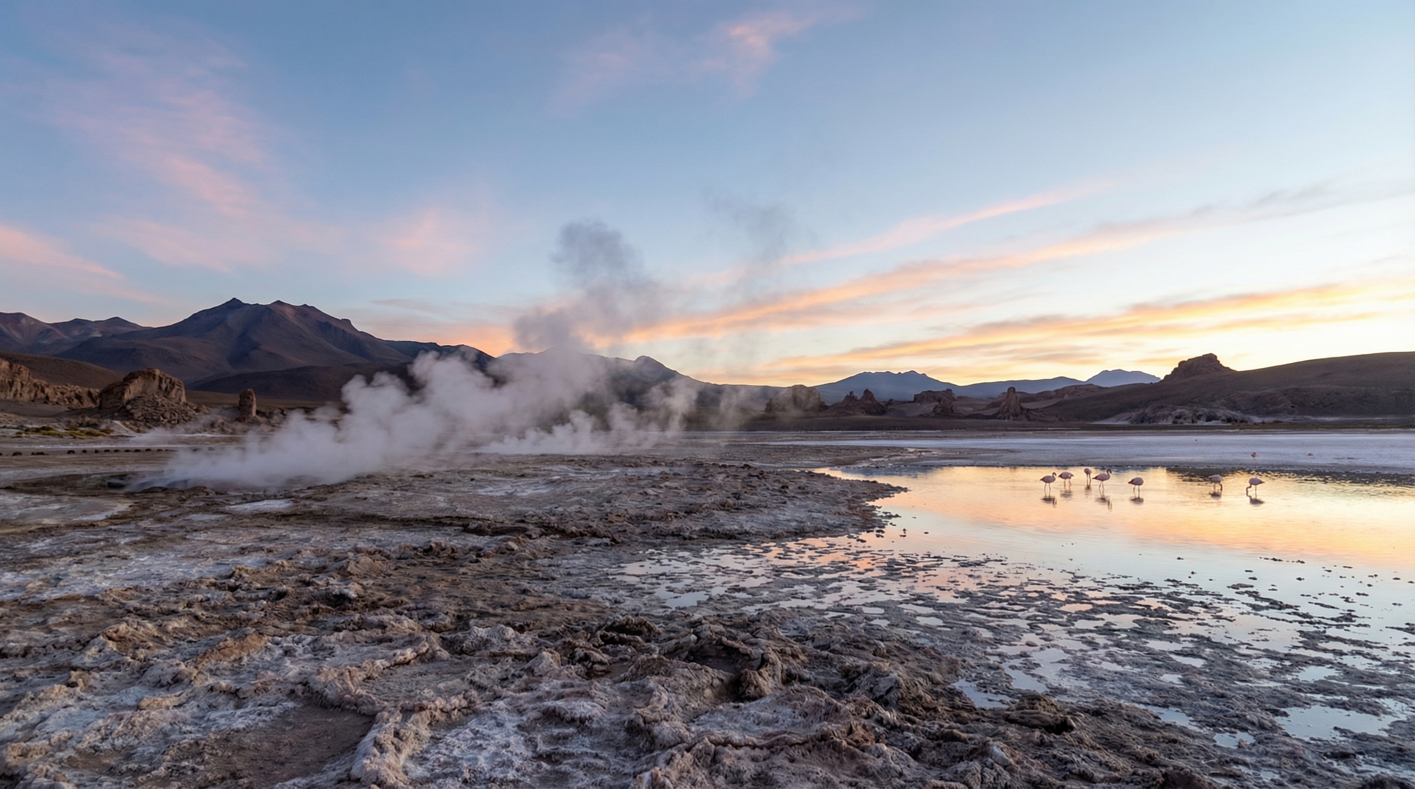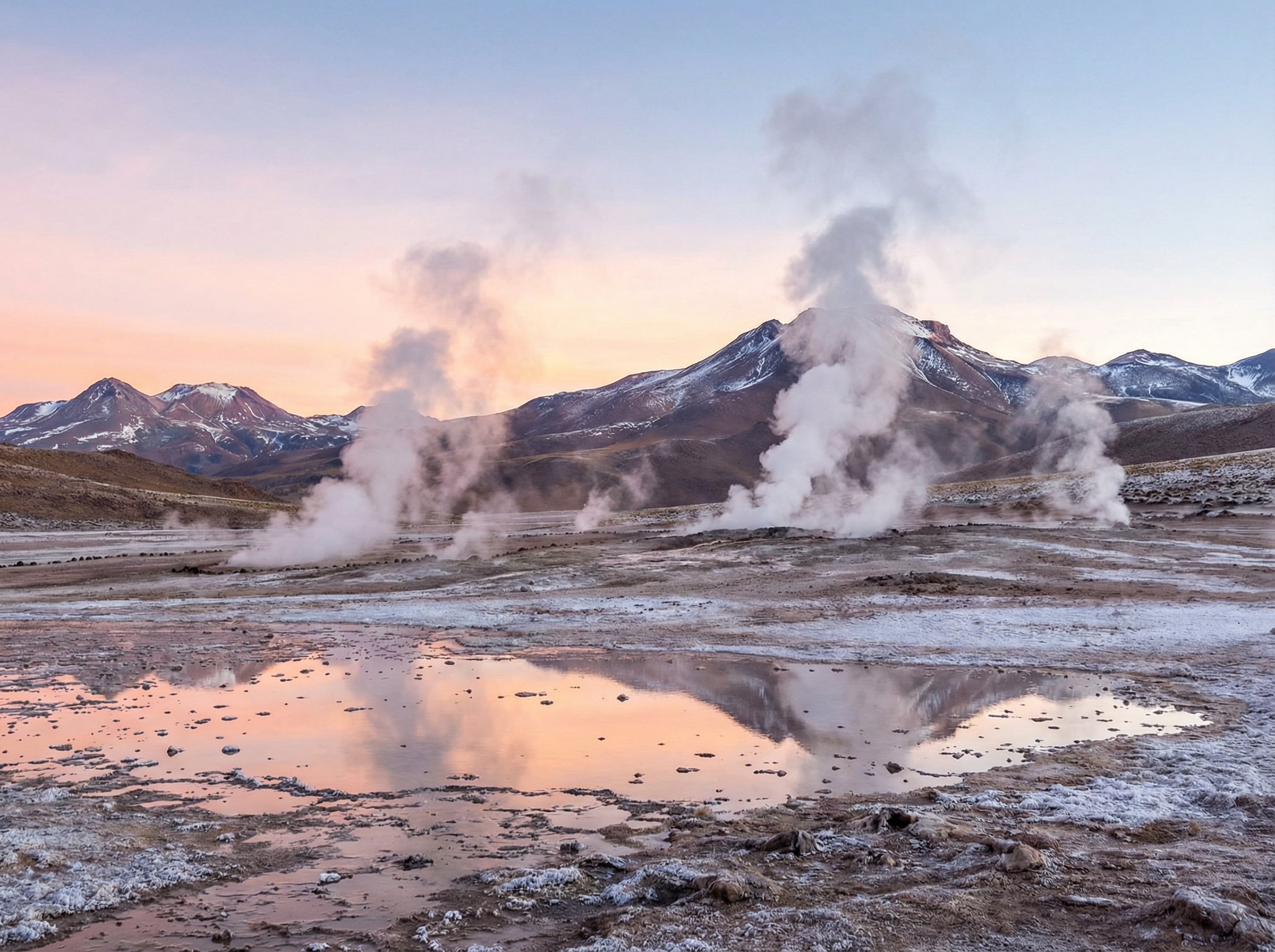 Naast droge vlakten en sterrenhemels kent de Atacama ook intense thermische activiteit. Geisers en warmwaterbronnen, zoals de beroemde El Tatio, spuwen bij zonsopkomst stoomkolommen die contrasteren met de koude, ijle berglucht. Die mix van dampende geisers, bevroren vlakken in de vroege ochtend en heldere lucht creëert dramatische licht-scènes die fotografen en natuurliefhebbers aantrekken. De wisselwerking tussen koude nachten en warme bronnen versterkt het gevoel van elementaire krachten op kleine afstand van elkaar.