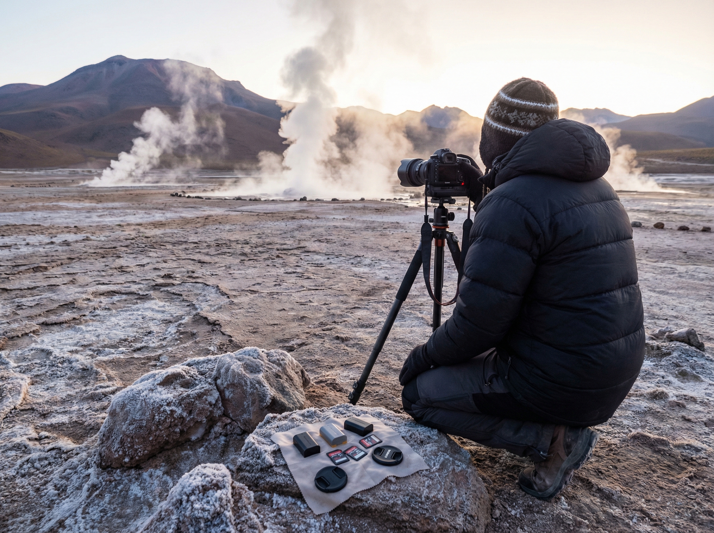 Bij zonsopgang bij geisers levert compositie rondom contrast en schaal het meeste op: zoek een sterk voorgrondvak zoals een warme bronring, rots of silhouet van een bezoeker om diepte te creëren, en plek jezelf zodanig dat de opstijgende stoom tegen het opkomende licht uitkomt. Experimenteer met korte sluitertijden om losse stoomdruppels en structuren te bevriezen, of juist langere belichtingen om zachte, vloeiende dampwolkjes te tonen. Vroeg aankomen geeft je tijd om het beste standpunt te vinden voordat het licht verandert en toeristen de scene vullen.