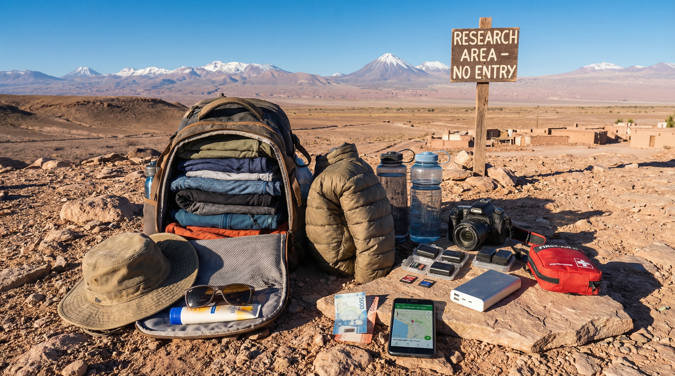 Neem vooraf de tijd om een praktische paklijst samen te stellen met lagen kleding voor koude nachten en zonnige dagen, een winddichte jas, stevige wandelschoenen, voldoende waterflessen, zonnebrand, een hoed en een zonnebril. Vergeet niet extra camera-accu’s en geheugenkaarten, een basis-EHBO-set en een geladen powerbank; voorzieningen zijn beperkt buiten San Pedro en Calama, dus voorraad meebrengen voorkomt ongemakken. Contant geld in Chileense peso’s is handig voor kleine aankopen en diensten op afgelegen plekken, al zijn er pinautomaten en betaalmogelijkheden in de grotere dorpen; controleer vooraf je pinlimieten en neem eventueel extra betaalmiddelen mee.