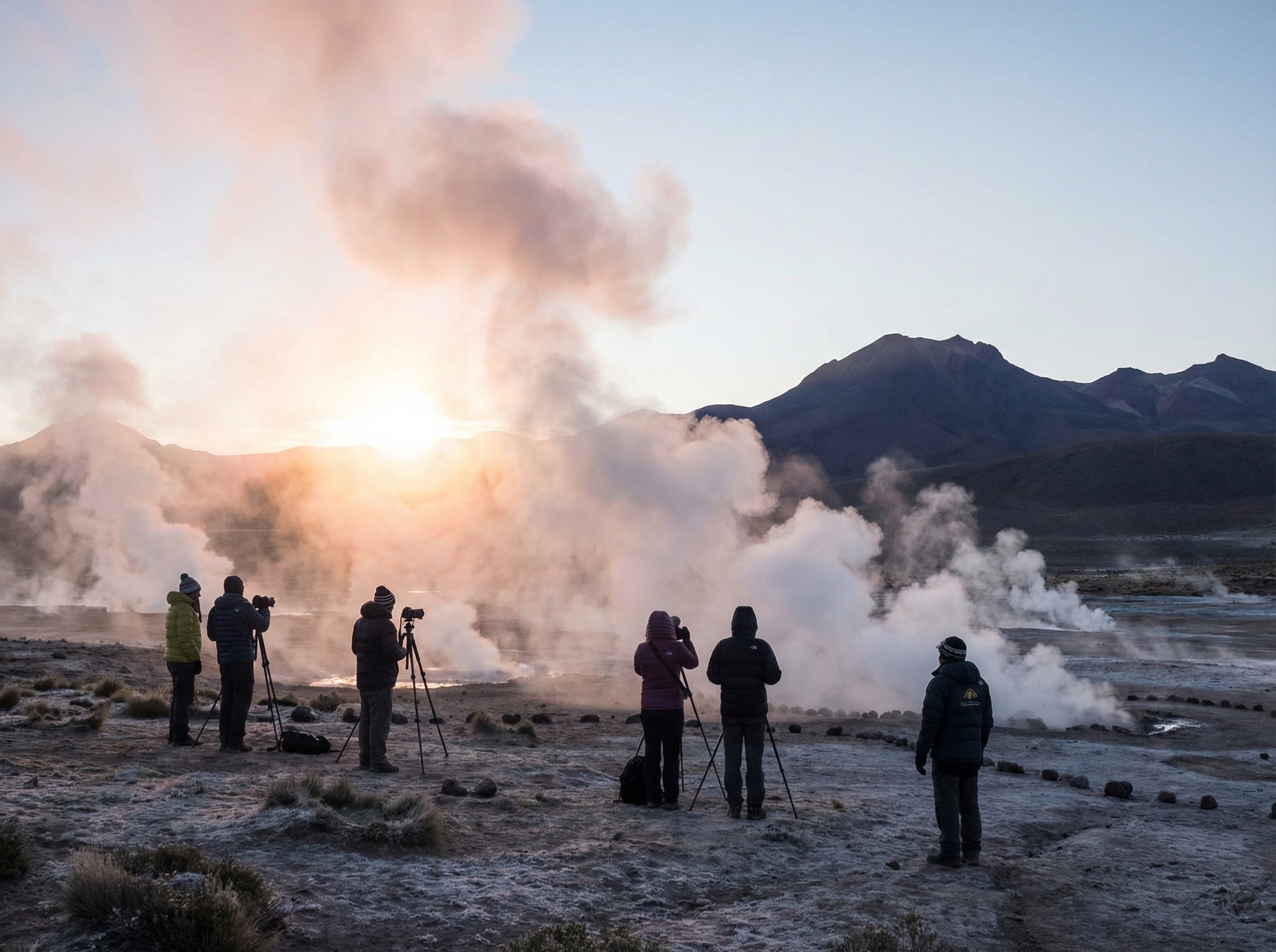 El Tatio ligt in het Andesgebergte van Noord-Chili, op het Altiplano en op rijafstand van San Pedro de Atacama van ongeveer 1,5 tot 2 uur (ruwweg 80–100 km). De geisers behoren tot de hoogste vulkanische velden ter wereld en zijn in de laagste ochtenduren op hun spectaculairst: het koude omgevingslucht zorgt voor dikke, fotogenieke stoompluimen zodra de zon opkomt. Daarom vertrekken bezoekers meestal in het donker; de uren rond zonsopgang tot circa twee uur daarna bieden de beste licht- en stoomcondities om het veld te bekijken en te fotograferen.