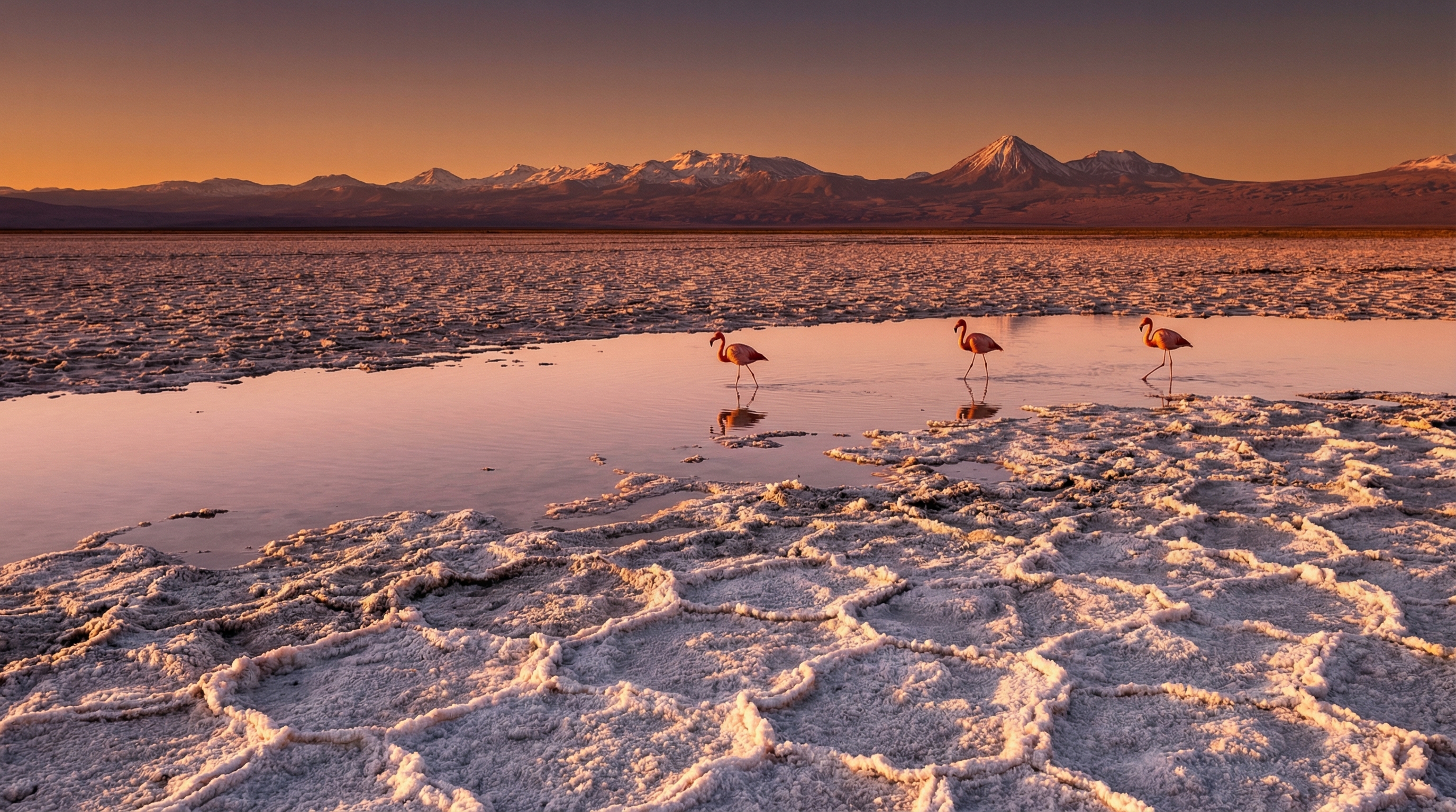Salar de Atacama onderscheidt zich door uitgestrekte, bijna witte zoutkorsten die op sommige plekken tot aan de horizon doorlopen, omgeven door bergen en hoogvlaktes die het contrast versterken. Het gebied herbergt unieke ecosystemen: ondiepe lagunes zoals Chaxa vormen vitale foerageergebieden voor flamingo’s die in drie soorten voorkomen en kleuraccenten toevoegen aan het wijdse landschap. Tegelijkertijd is de salar economisch belangrijk vanwege zout- en lithiumwinning uit ondergrondse pekel; industriële installaties liggen veelal afgezonderd, waardoor natuur- en industriegebieden duidelijk gescheiden blijven.