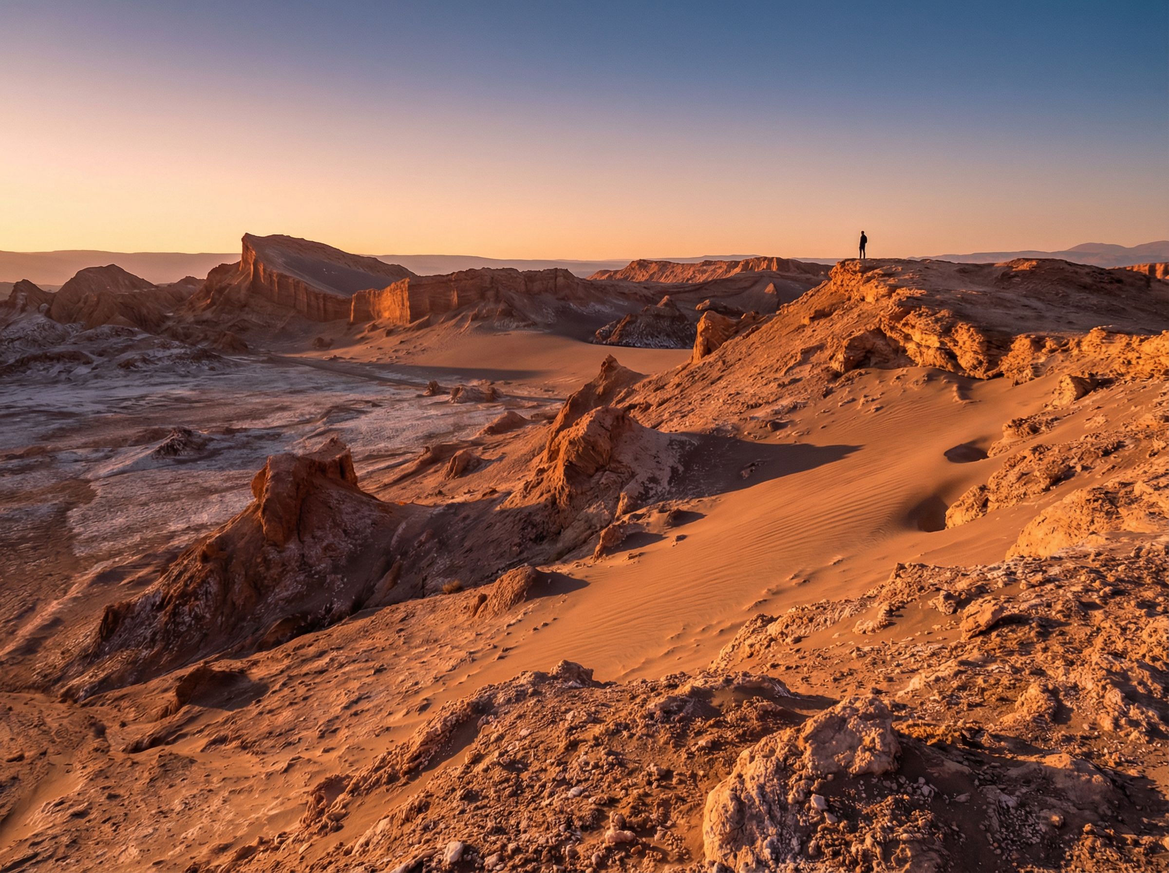De Atacama trekt reizigers met een bijna mythische intensiteit: een van de droogste plekken op aarde waar het landschap is uitgesleten tot grillige vormen die aan maanlandschappen doen denken. Uitgestrekte vlakten van stof en zand wisselen af met rotspartijen, ravijnen en zoutkorsten die in het zonlicht veranderen van bleke crème naar fel wit. Deze extreme droogte legt lagen en structuren bloot die elders verborgen blijven, waardoor elk uitzichtpunt aanvoelt als een natuurlijke sculptuur vol textuur en contrast.