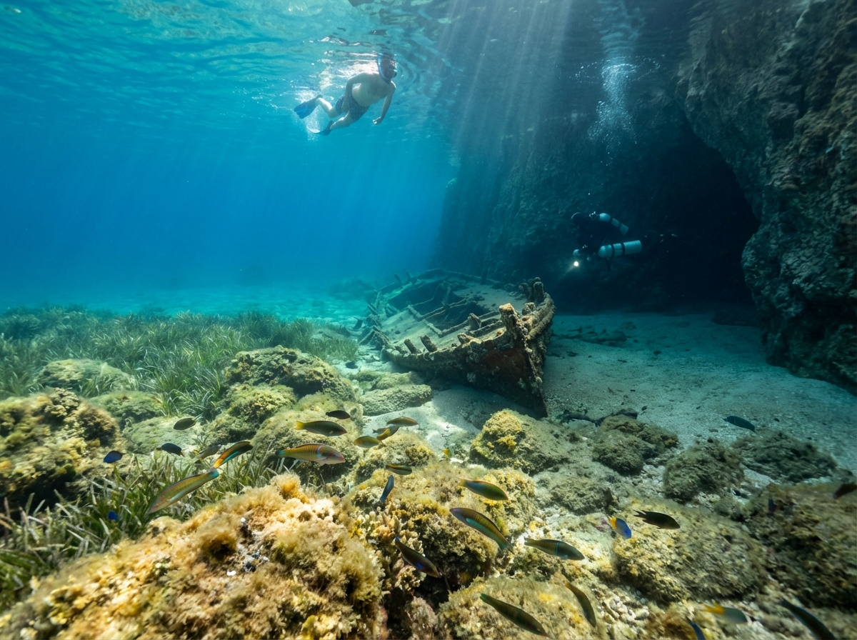 Onder water onthult de kust een verrassend gevarieerd landschap: imposante rotswanden die scherp in het blauw vallen, intieme grotten en overhangen die speelse lichtinval creëren, ondiepe riffen waar juveniele vissoorten zich verschuilen en bovendien verspreide wrakken die het mediterrane verhaal verrijken. Die mix van structuren biedt iedere duiker of snorkelaar iets anders: beginnende duikers kunnen oefenen op ondiepe riffen en bij grotten met gidsen, terwijl gevorderden zich kunnen uitleven op wanden en wrakduiken die technische vaardigheden en goede navigatie vereisen.
