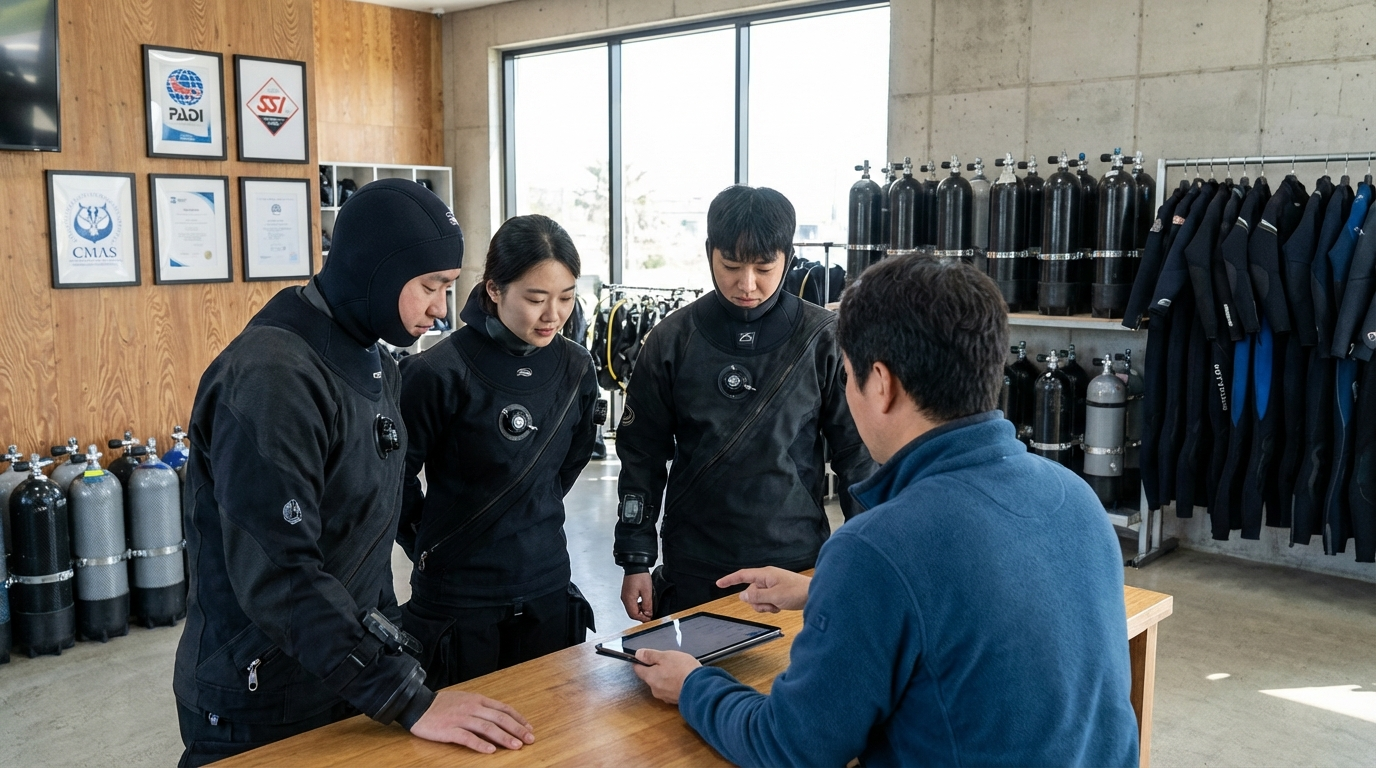 Let op de staat van de uitrusting en het onderhoudsbeleid: moderne, goed onderhouden duiksets, regelmatige servicegeschiedenis van compressoren en ademautomaten en schone, passende wetsuits zijn tekenen van professionaliteit. Vraag naar de gebruikscondities van huurspullen en of de school persoonlijke inspecties uitvoert voor elke duik. Even belangrijk is de groepsgrootte en begeleidingsratio; kleine groepen en een lage diver-to-guide ratio zorgen voor meer persoonlijke aandacht en veiliger begeleiding, vooral voor minder ervaren duikers.