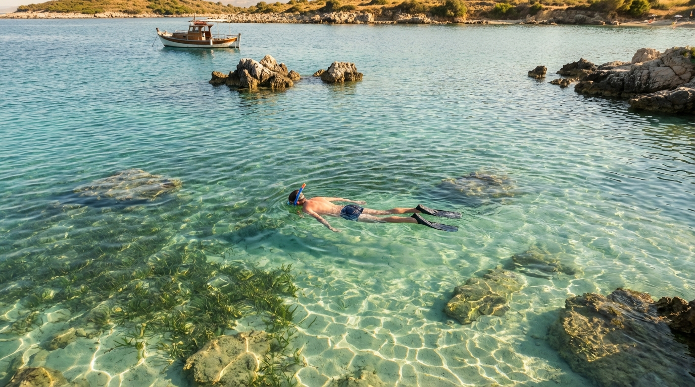 Ksamil is een van de beste plekken om te snorkelen langs de Albanese kust dankzij de vele kleine eilandjes en ondiepe baaien waar helder water en beschutte omstandigheden samenkomen. Het ondiepe zeebed en de verspreide rotsformaties creëren ideale plekken om zonder veel diepteverschil scholen vis, zee-egels en zeegrasvelden te observeren, en de korte afstanden vanaf het strand maken het aantrekkelijk voor gezinnen en minder ervaren snorkelaars. In de vroege ochtend zijn de wateren vaak het kalmst en het zicht het beste, waardoor je meer kans hebt op onbelemmerd zicht en rustig snorkelen.