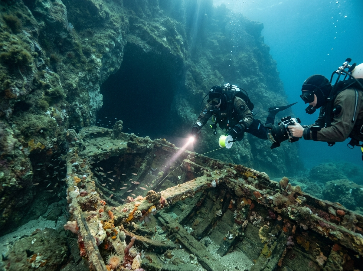 Qua uitrusting is meer nodig dan bij gewone kustduiken: naast een betrouwbare duikcomputer en primaire lamp is een reserve‑lamp of backup torch essentieel voor grotten en wrakken, net als een reel of richtingslijn voor penetratie, een surface marker buoy voor de boot, en bij dieper of technisch werk dubbele ademluchtbronnen of een ponyfles. Veel duikcentra bieden speciale uitrusting en begeleiding, maar vooral bij wrak- en grotduiken blijft het advies hetzelfde: alleen met de juiste training, geschikte gear en een ervaren team naar binnen gaan, geen penetratie zonder opleiding en altijd vooraf duidelijke afspraken maken over procedures en signalen.
