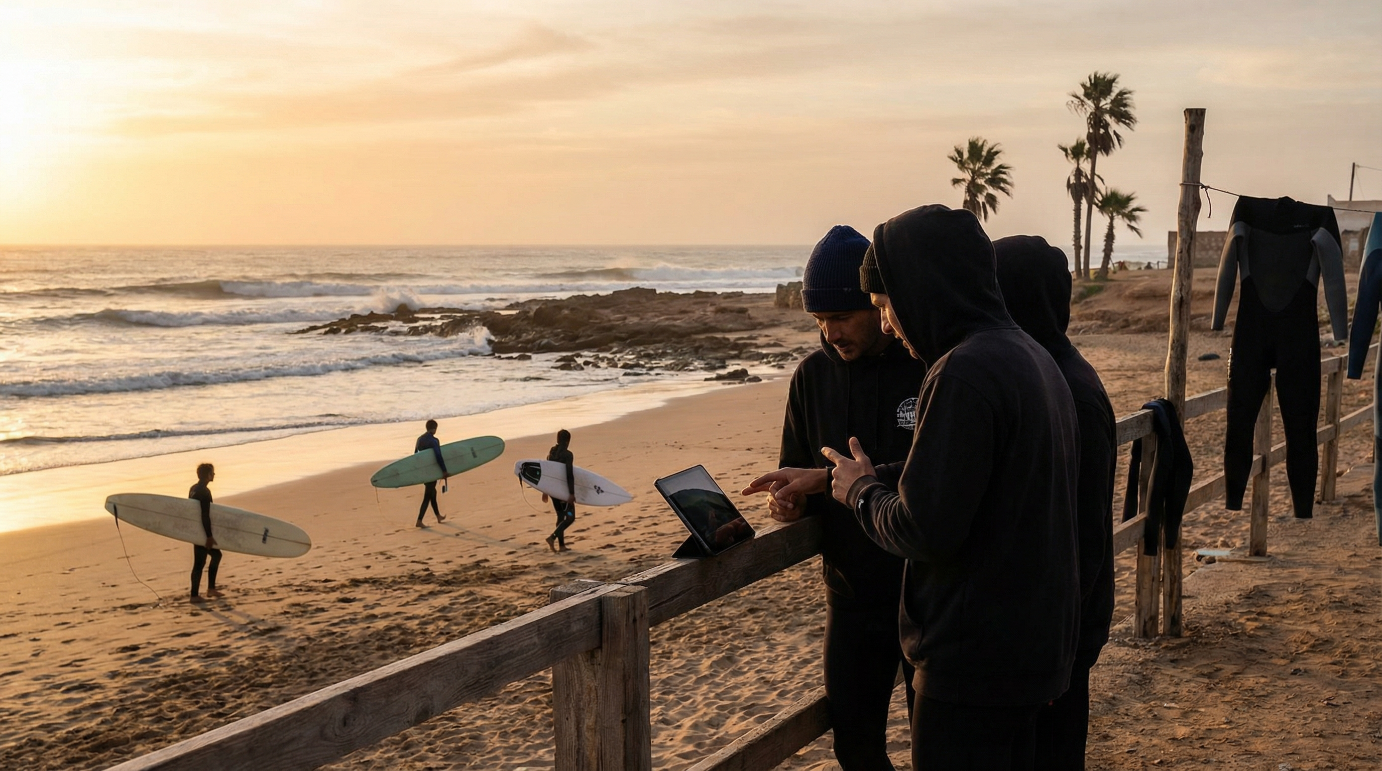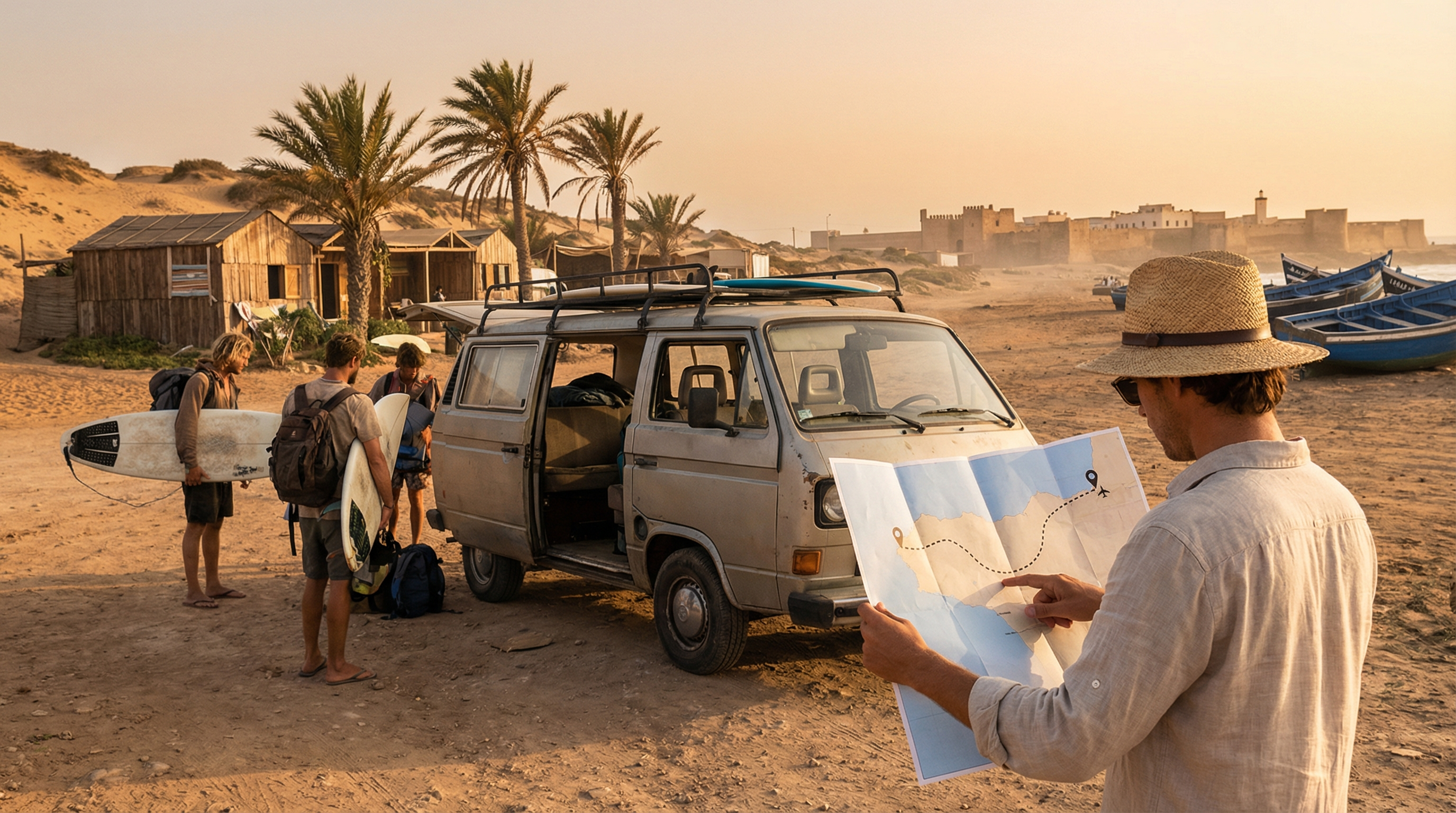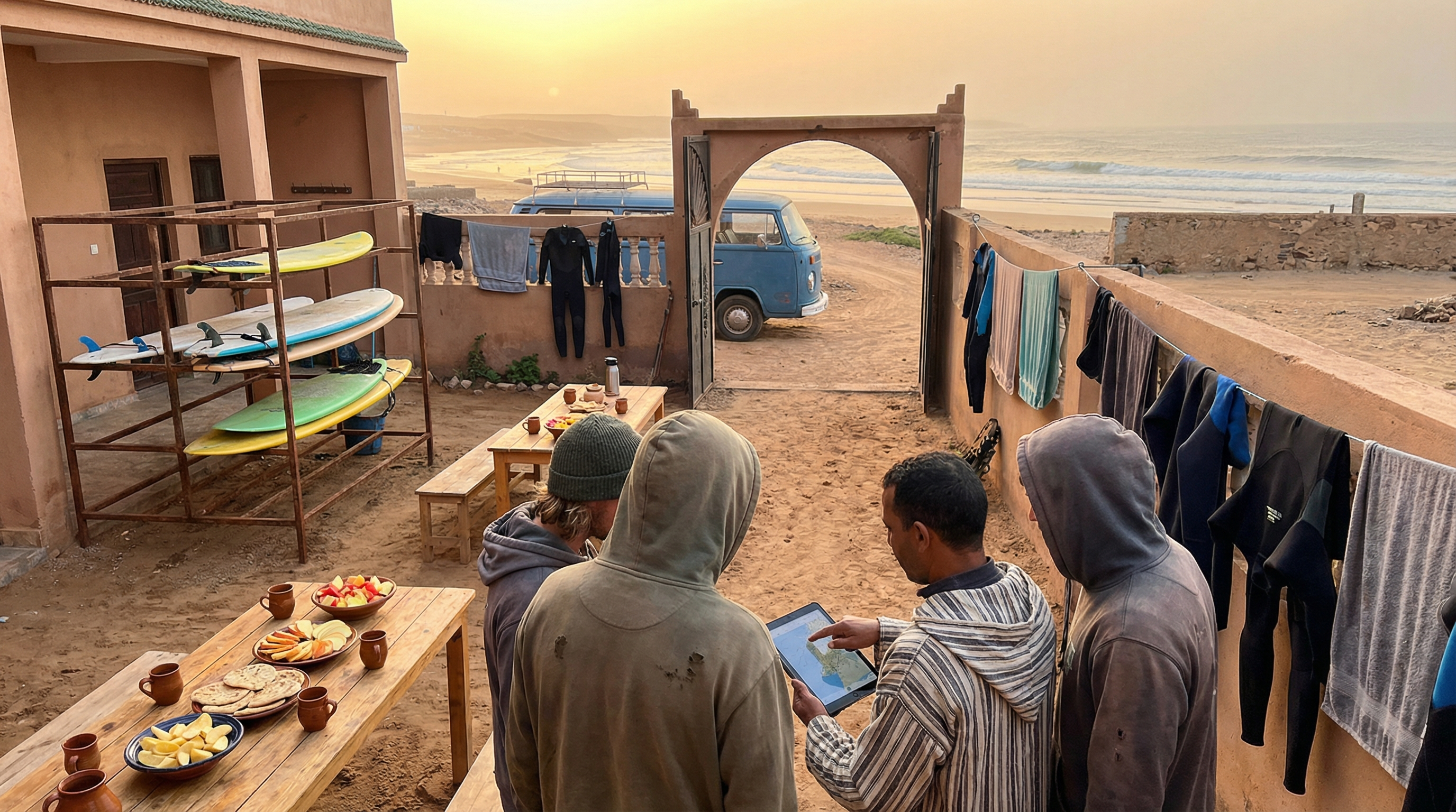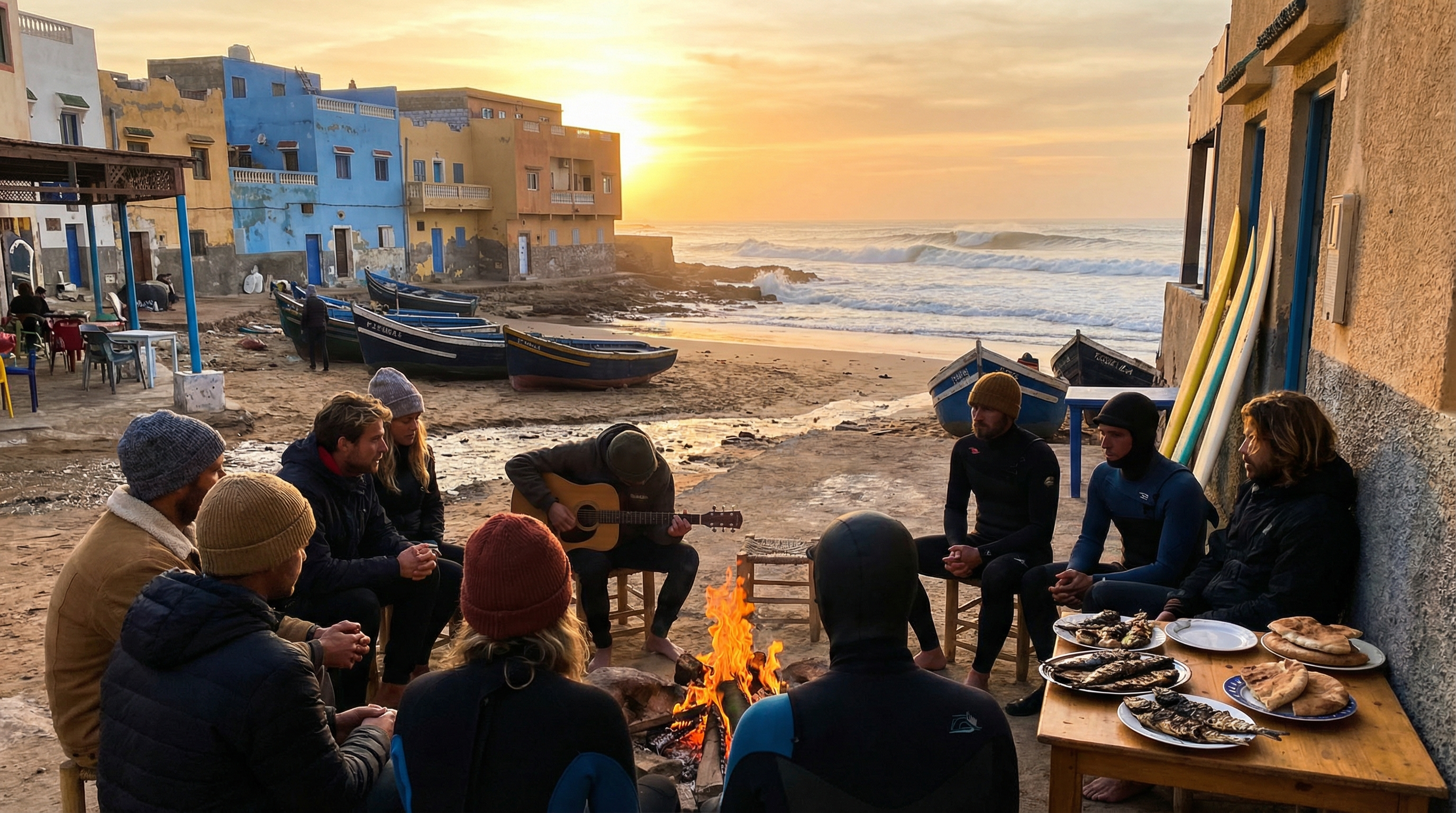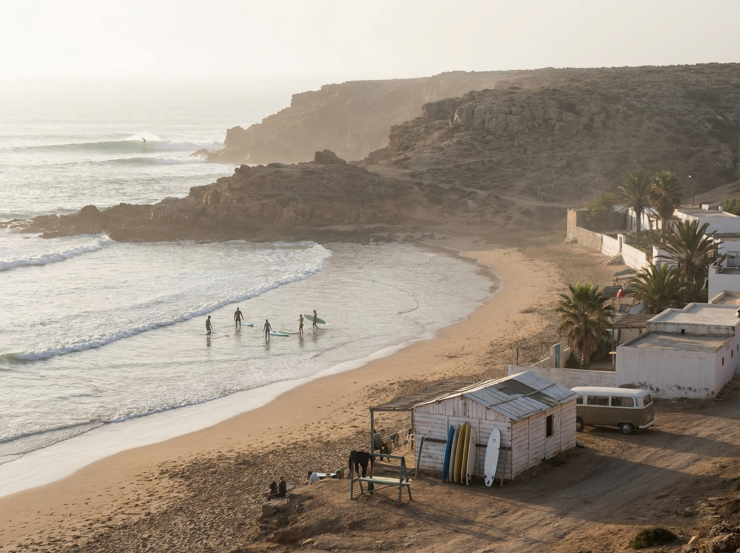 Langs de ruige Atlantische kust van Marokko ontstond surfcultuur niet in één keer maar geleidelijk, als een samenspel tussen aardse tradities en reizigersdrift. Kleine vissersdorpjes aan de kust stonden lange tijd in het teken van netten, bootten en de dagelijkse vangst; de zee bepaalde ritmes en rituelen. Toen buitenlandse surfers de eerste pointbreaks en zandbanken ontdekten, ontstond een nieuwe dynamiek: lokale ondernemers begonnen surfplanken te repareren, eenvoudige cafés serveerden koffie aan bezoekers en huizen werden omgevormd tot slaapgelegenheden voor reizigers die de swell wilden volgen.