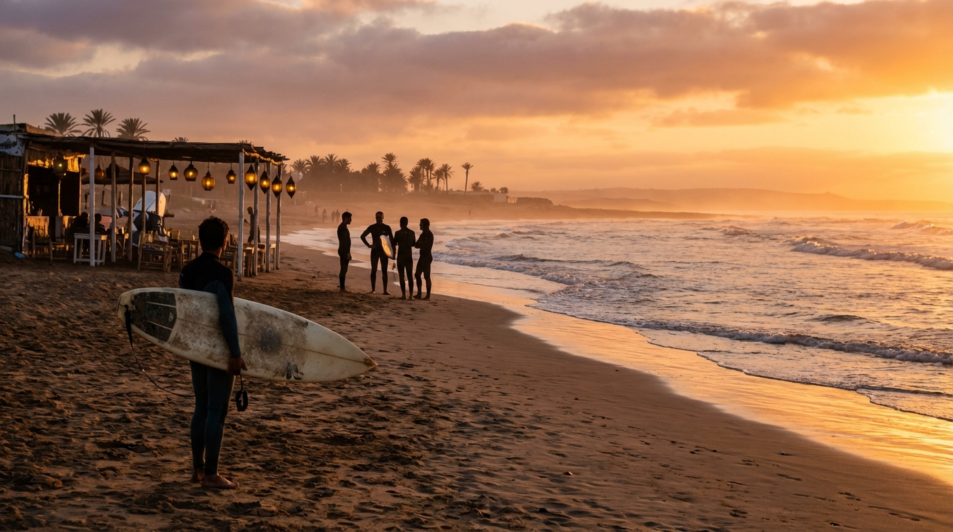 In plaatsen als Taghazout en Essaouira ontwikkelden zich kleurrijke strandgemeenschappen waar de golven invloed hadden op het sociale leven. Surfscholen en verhuurbedrijven introduceerden een gestage stroom van internationale gasten, maar ook muzikanten, koks en kunstenaars vonden er inspiratie. Avonden op het strand werden net zo belangrijk als de ochtendsets: akoestische gitaren, Gnawa-ritmes en de geur van gegrilde vis of tajine verbonden bezoekers met lokale gewoonten. Deze culturele kruisbestuiving leidde tot markten met handgemaakte surfartikelen, cafés die lokale gerechten met internationale smaken combineerden, en informele ontmoetingsplekken waar ervaring en verhalen werden doorgedeeld.