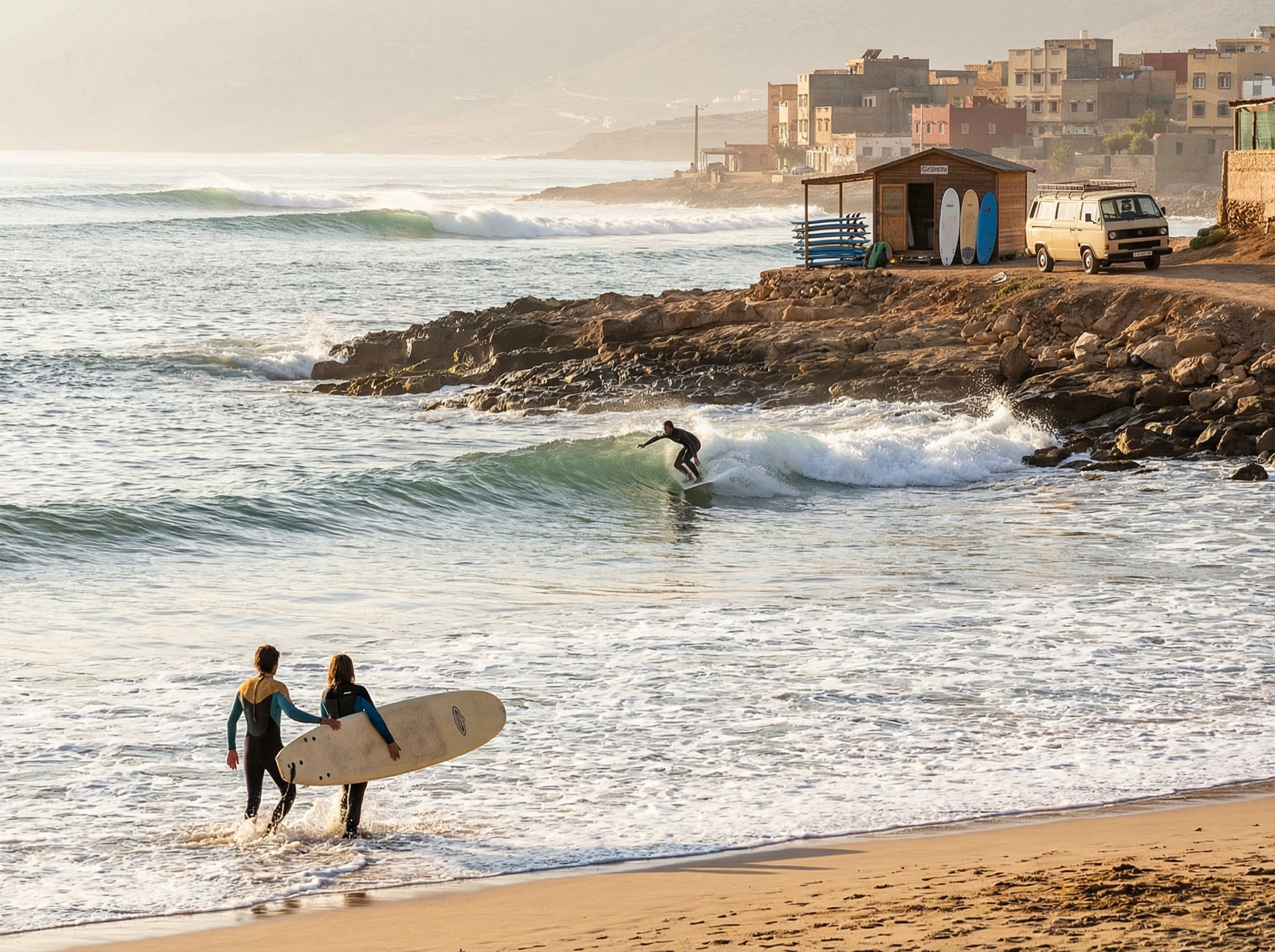 Iets verderop toont Imsouane een heel ander karakter met een van de langste rechte golven aan de Afrikaanse kust. De beroemde long right van Imsouane is geliefd bij longboarders en intermediate surfers omdat hij kilometerslange ritten kan bieden wanneer de swell meewerkt, en op kleine dagen verrassend vergevingsgezind is. Daardoor vormt Imsouane een uitstekende plek om meters te maken en techniek te oefenen, terwijl je tegelijk geniet van het rustige vissersdorpgevoel.