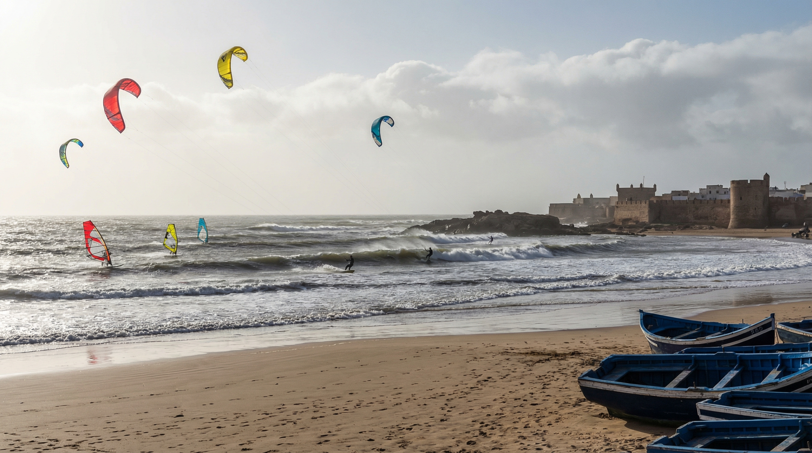 Essaouira heeft een karakter dat duidelijk verschilt van het meer surfgerichte zuiden van Marokko: hier domineren wind en open stranden het beeld. De stad ligt aan een breed strand en vangt in de zomermaanden regelmatige noordoostelijke wind, de beroemde alizé, waardoor Essaouira uitgroeide tot een van de beste spots voor windsurfen en kitesurfen in Noord-Afrika. Die krachtige, aanhoudende wind zorgt voor consistente planerende condities en trekt een internationale community van windatleten en instructors aan.