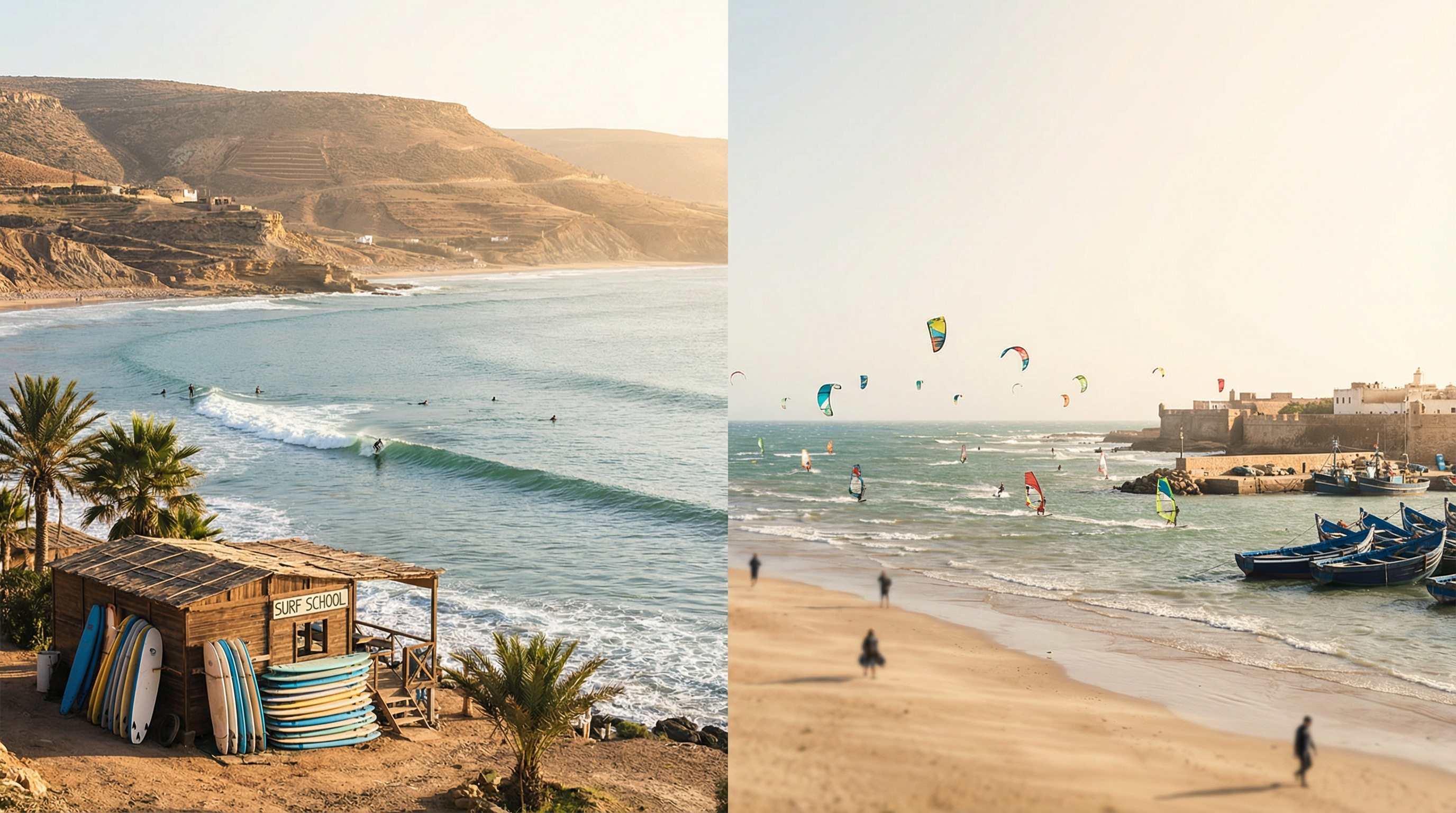 Qua voorzieningen verschillen de plekken in toon: Taghazout is meer gericht op surfcommunity en verblijfsarrangementen die rond de golven draaien, terwijl Essaouira een bredere toeristische infrastructuur heeft met meer focus op windsports en stedelijke attracties. Voor wie reisplanning belangrijk is: kies Taghazout als je prioriteit bij consistente surf en surflessen ligt en bereid bent transfers via Agadir te nemen; kies Essaouira als je wind- of kitesurfen wilt combineren met culturele uitstapjes en een meer gemêleerde strandervaring.