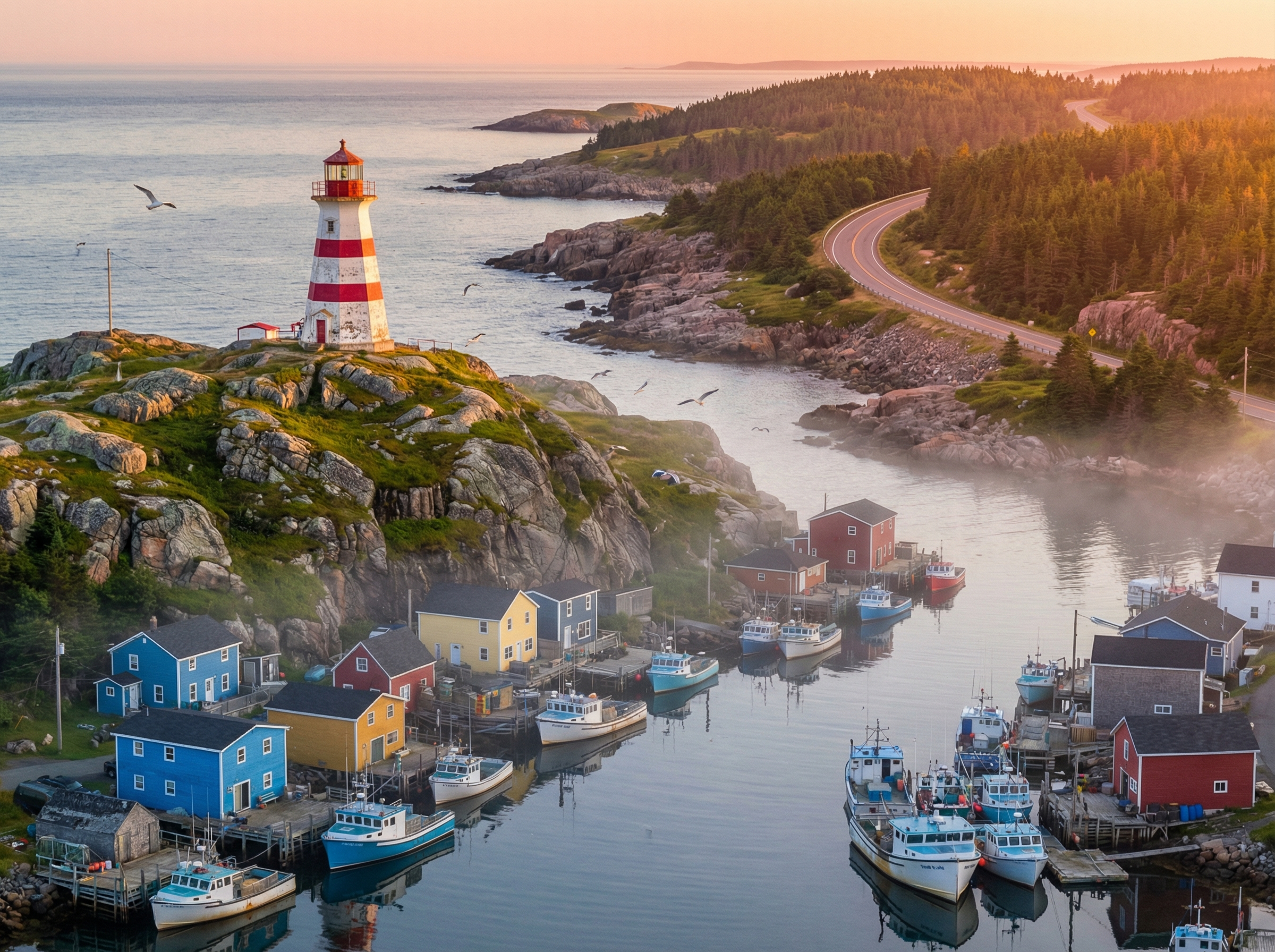 Samen vormen Cabot Trail, Nova Scotia en eilandhoppen een veelzijdig reisgebied waarin natuur, geschiedenis en lokale levenskunst elkaar aanvullen. Reizigers vinden er wandelingen langs zeekliffen, kajaktochten langs rotsformaties en momenten van stilte in kleine dorpskafés waar verse kreeft of schelpdieren op de kaart staan. Op een bewolkte ochtend kun je vanaf een houten pier kijken naar zeevogels die tussen de golven duiken en vissersboten die langzaam terugkeren naar de haven, een beeld dat de maritieme ziel van deze regio treffend verbeeldt.