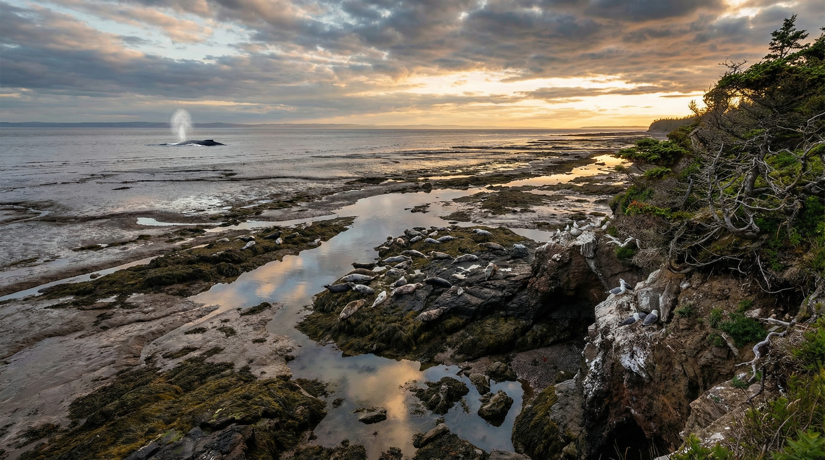 De kusten van Atlantisch Canada herbergen een rijke combinatie van vegetatie en dierleven: van zilte graslanden en salt marshes bij estuaria tot pijnboombossen en kale, windgebeten barrens op hoger gelegen kliffen. In zee trekken regelmatig walvissen voorbij — vooral humpbacks en minkes — terwijl rotsige punten en zandbanken rustplaatsen bieden aan zeehonden en bruinvissen. Langs de kust en op afgelegen eilandjes vormen zeevogels grote kolonies; aalscholvers, jan-van-genten en in specifieke jaren zelfs papegaaiduikers vullen de lucht en maken de kusten levendig en fotogeniek.