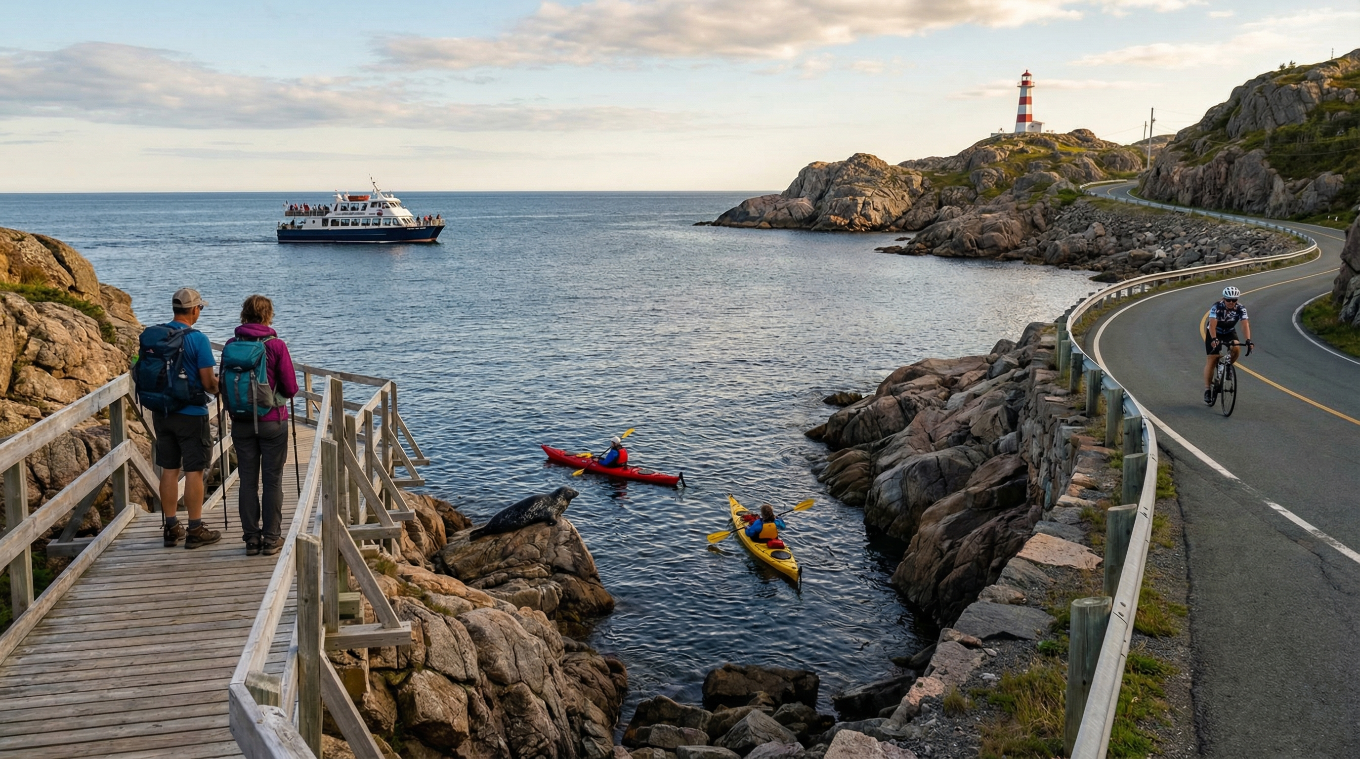 Kajakken en zee-kayaktochten geven toegang tot stille baaien, zeehondenkolonies en verborgen inhammen. Voor beginners en gezinnen zijn vlakwaterpeddeltochten in beschutte baaien het meest geschikt en vaak worden er korte introducties en reddingsoefeningen aangeboden. Avonturiers kiezen voor open-zeekajaks bij ruiger weer en getijden, maar die tochten vereisen ervaring, geschikte uitrusting en aandacht voor getijde- en weersvoorspellingen. Voor beide groepen is het verplicht om veiligheidsmateriaal te hebben en instructies van lokale operators op te volgen.