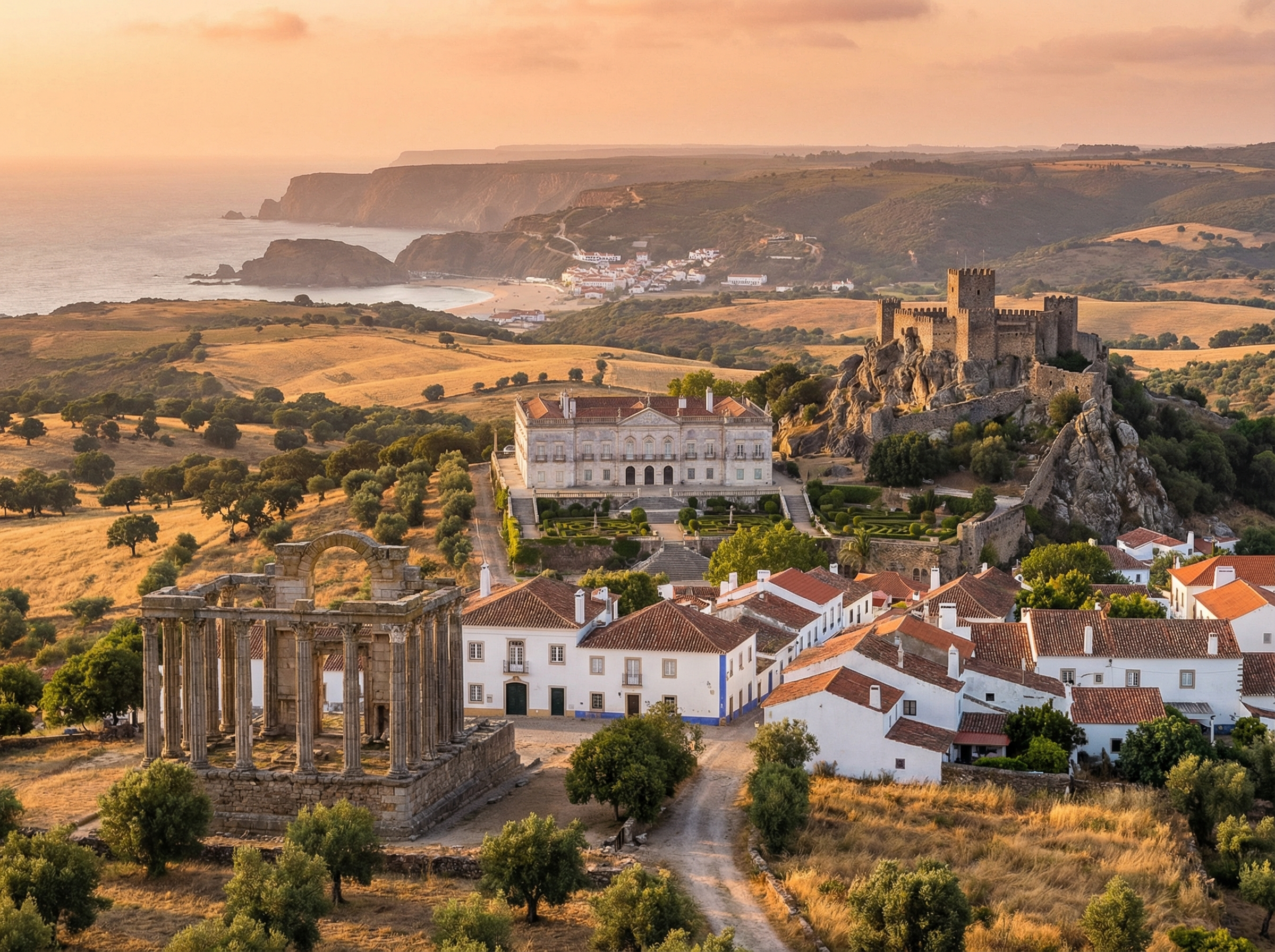 In het noorden van de Alentejo, op de Serra de São Mamede, lijken Marvão en Castelo de Vide geplakt aan de rotsen; hun versterkte burchten en smalle straatjes bieden koelte en spectaculaire vergezichten over het omringende bergland. Aan de zuidkust tenslotte liggen kustplaatsen als Vila Nova de Milfontes en Zambujeira do Mar, waar gouden stranden, ruige kliffen en verse zeevruchten elkaar ontmoeten, en waar zonsondergangen het landschap omtoveren tot een onvergetelijk decor tijdens een ontspannen tussenstop.