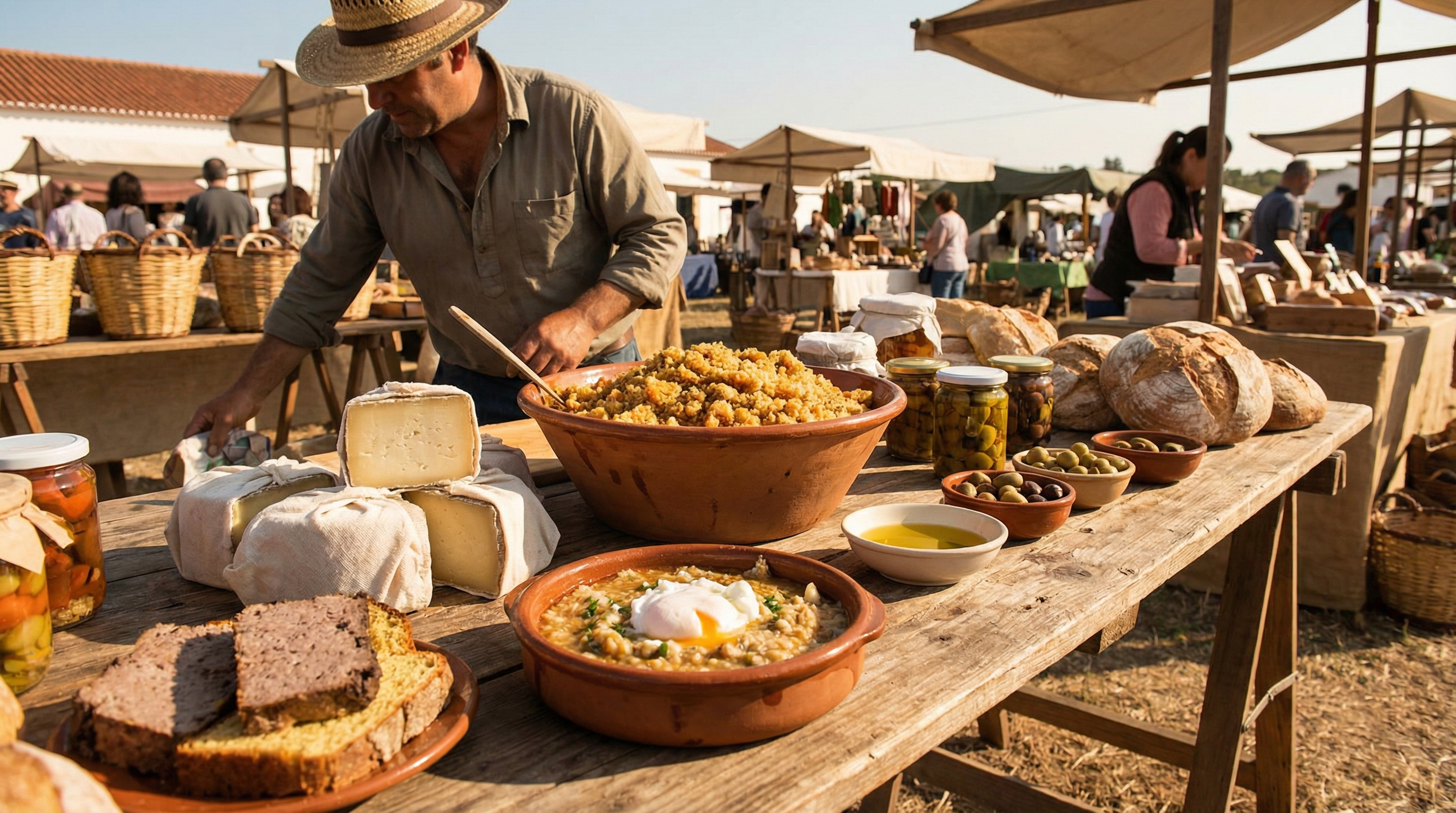 De keuken van de Alentejo is eenvoudig en hartig, geworteld in landbouw en seizoenen. Migas, een gerecht van platgestampt brood met knoflook, olijfolie en soms vlees of groenten, weerspiegelt het slimme gebruik van restjes en vult de maag na een dag in het veld. Açorda, een soepachtige broodschotel met knoflook, koriander en vaak een gepocheerd ei of zeevruchten, biedt zachte texturen en intense rustieke smaken. Alentejaanse kazen variëren van romig tot krachtig, vaak gemaakt van schapen‑ of geitenmelk en perfect met lokaal brood en een scheut olijfolie. Pâtés en conservas van lokale vleeswaren behoren eveneens tot de tradities; ze worden geserveerd op brood of als onderdeel van kleine gerechten en tonen ambachtelijke technieken die van generatie op generatie zijn doorgegeven.