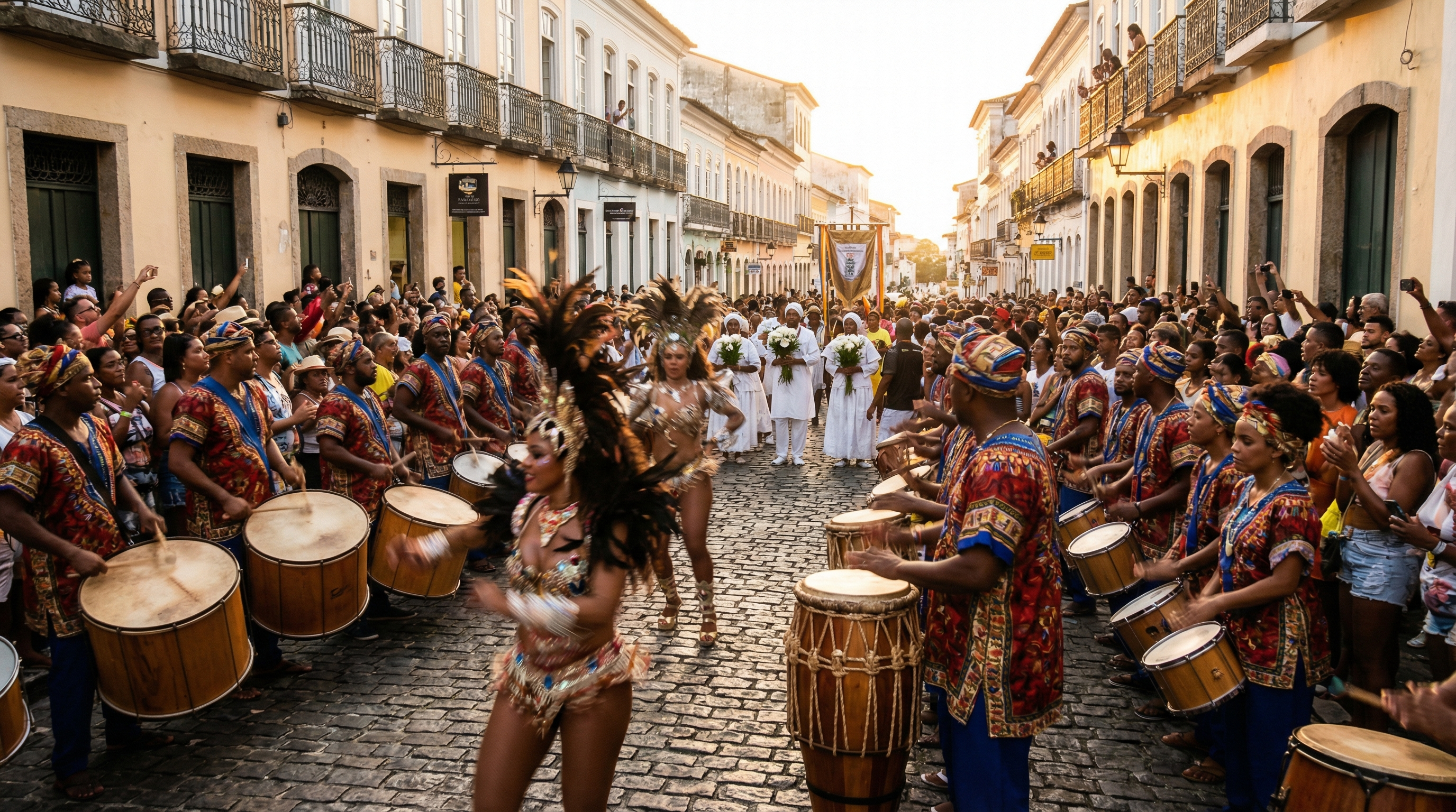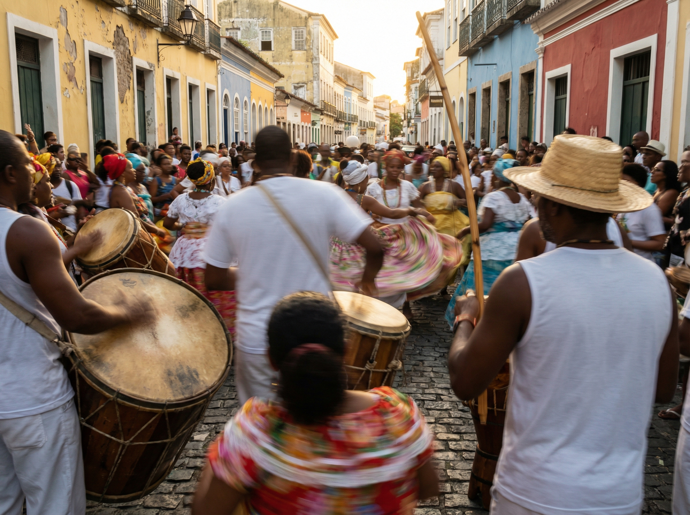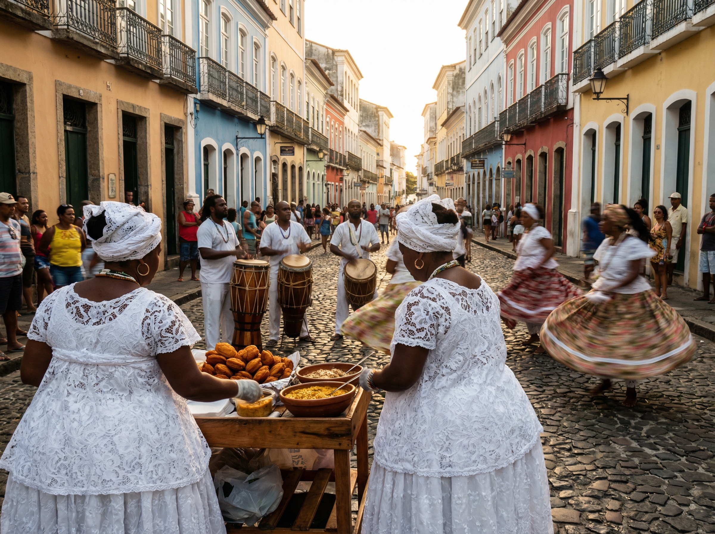 Salvador, de bruisende hoofdstad van Bahia, is een levend schrijn van Afro-Braziliaanse tradities: trommels die het ritme van ancestrale verhalen bepalen, pittige geuren van dendê en kruiden, en ceremonies waarin geloof en identiteit samenkomen. Hier vormen muziek, keuken en ceremonies een dynamische uitdrukking van wederstand, verwantschap en levenskracht.
