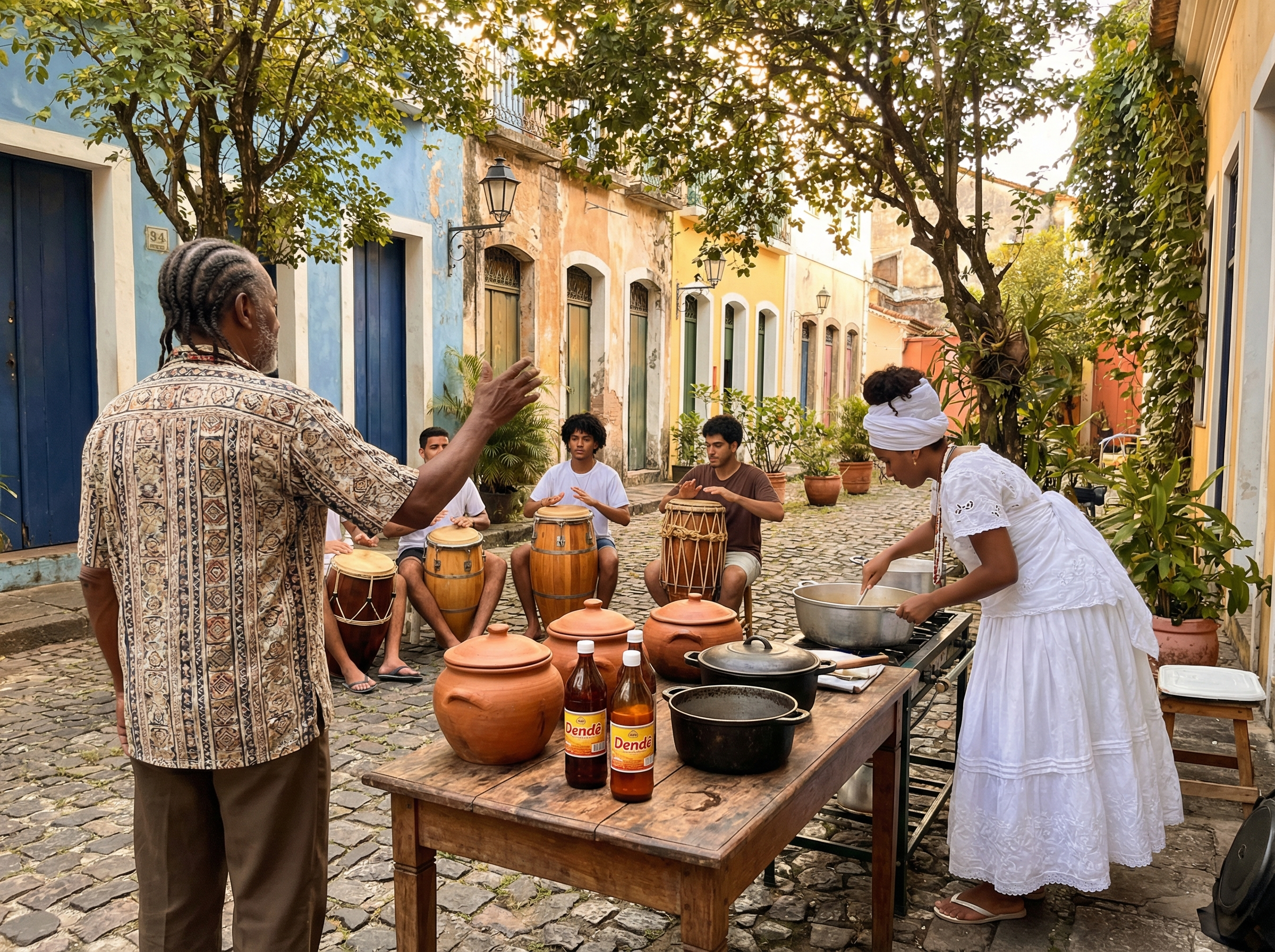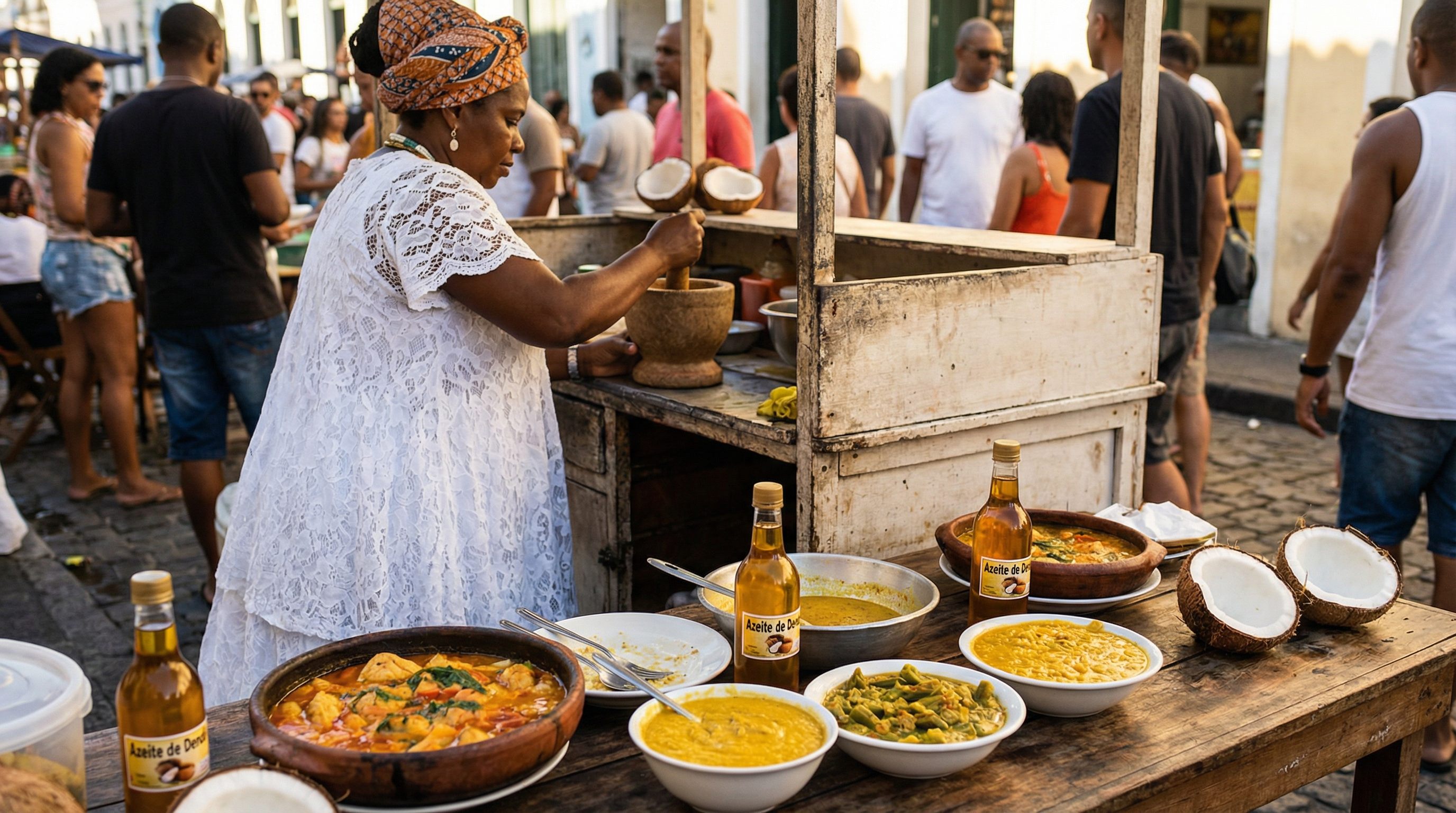 De keuken van Bahia is een tastbare echo van de Afrikaanse aanwezigheid in de regio: smaken, geuren en texturen vertellen verhalen van reizen, aanpassing en devotie. Acarajé, gefrituurd in dendê-olie en gevuld met pittige camarão- of vatapá-smaken, functioneert zowel als straatvoedsel als offergave in religieuze contexten. Moqueca, een geurige stoofpot van vis in kokosmelk en dendê, toont de samensmelting van Afrikaanse en inheemse kooktechnieken, terwijl vatapá en caruru met hun rijke pinda- en okra-essenties herinneren aan gemeenschappelijke ingrediënten die door slaven zijn meegenomen en lokaal zijn aangepast.