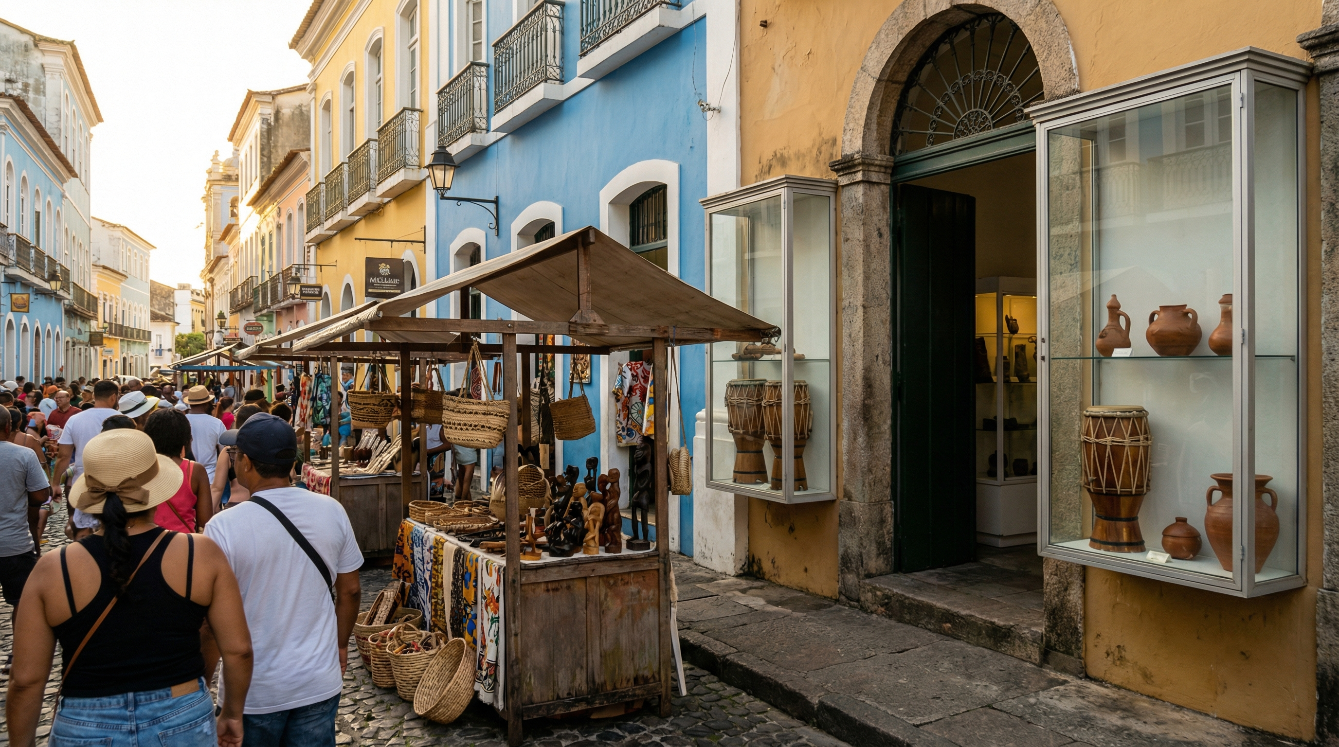 Niet ver daarvandaan biedt Mercado Modelo een meer marktgerichte inkijk in ambacht en dagelijks leven. Kraampjes vullen de hal met kleurrijke textiel, handgemaakte beelden, sacred beads en kostuums die verwijzen naar carnaval en religieuze tradities. Bezoekers kunnen er ook lokale gerechten proeven en met ambachtslieden in gesprek gaan over de technieken achter borduurwerk, houtsnijwerk en keramiek, waardoor materiële cultuur tastbaar wordt en verhalen over herkomst en vakmanschap hoorbaar zijn.
