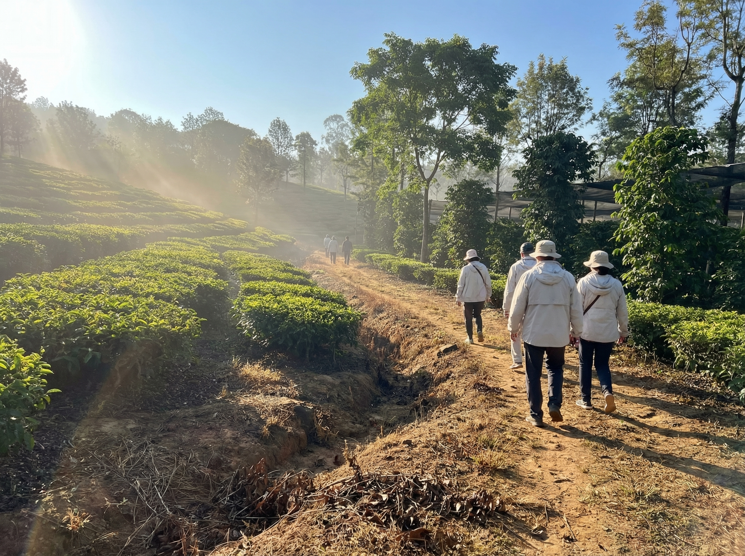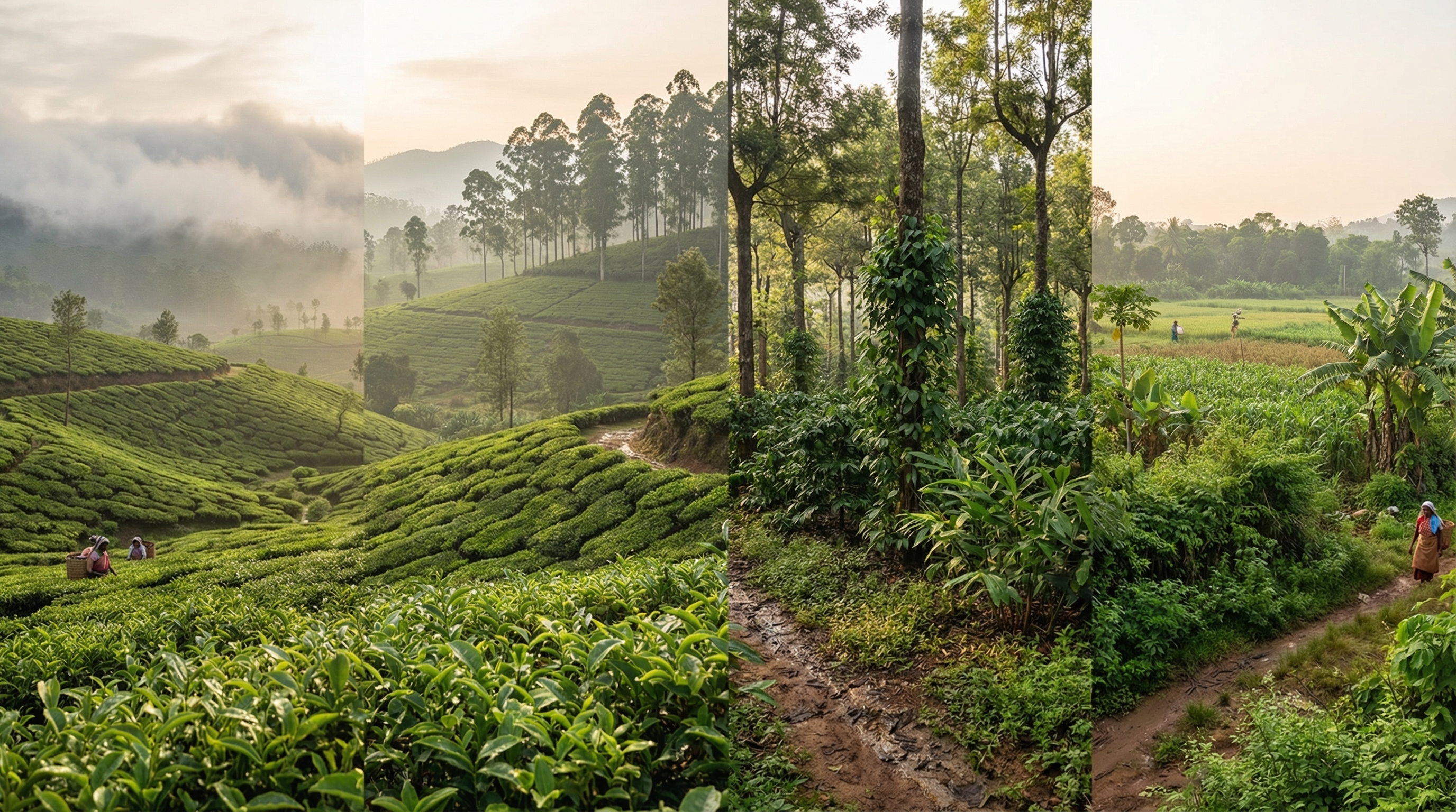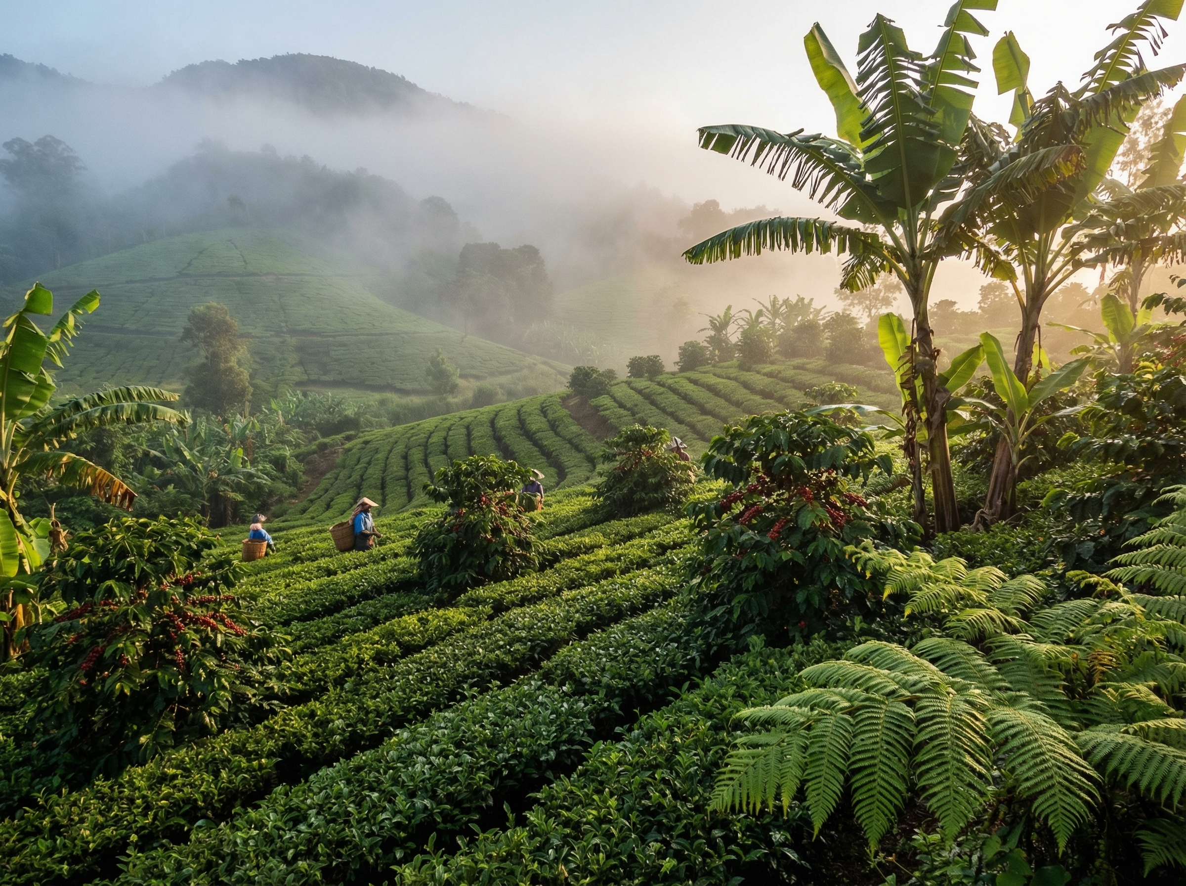 Nevelbanken kruipen langs de hellingen en hullen eindeloze rijen theestruiken in een zachte, zilveren sluier; de bladeren glanzen nat van ochtenddauw terwijl het licht breekt tussen bananenbomen en verwilderde varens. Tussen de groene terrassen tekenen zich de lagere, dichtbegroeide koffiestruiken af, hun kersen rood en glanzend in contrast met diepte van het landschap. Het geluid is ingetogen: het ritselen van bladeren, het zachte gekraai van vogels en soms het verre geroep van arbeiders die tussen rijen ploegen — een landschap dat zowel rust als levendigheid ademt.