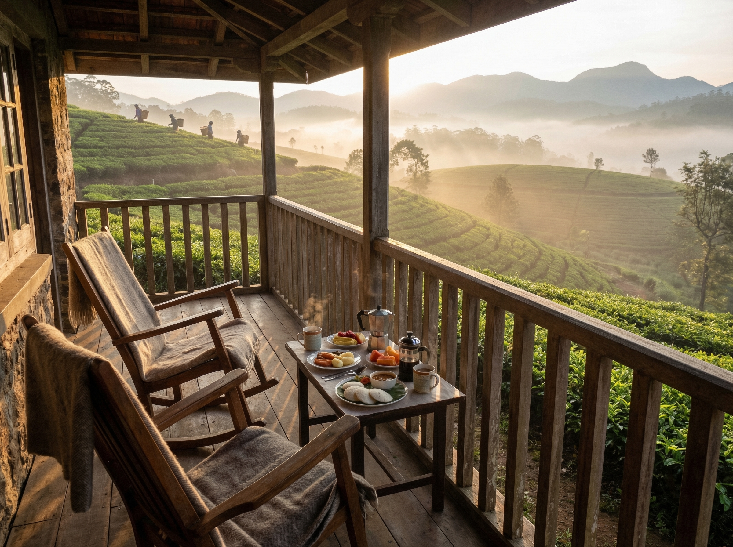 Verblijven op een estate-bungalow geeft vaak het gevoel van terug in de tijd stappen: houten veranda’s met uitzicht over terrassen, hoge plafonds en antiek meubilair gecombineerd met moderne gemakken. Veel bungalows zijn ooit gebouwd door plantage-eigenaren en stralen die koloniale sfeer uit, waardoor je ’s ochtends direct tussen theestruiken of koffiestruiken staat. De rust en ruimte zijn kenmerkend; wandelingen over het terrein beginnen vaak letterlijk bij de achterdeur.