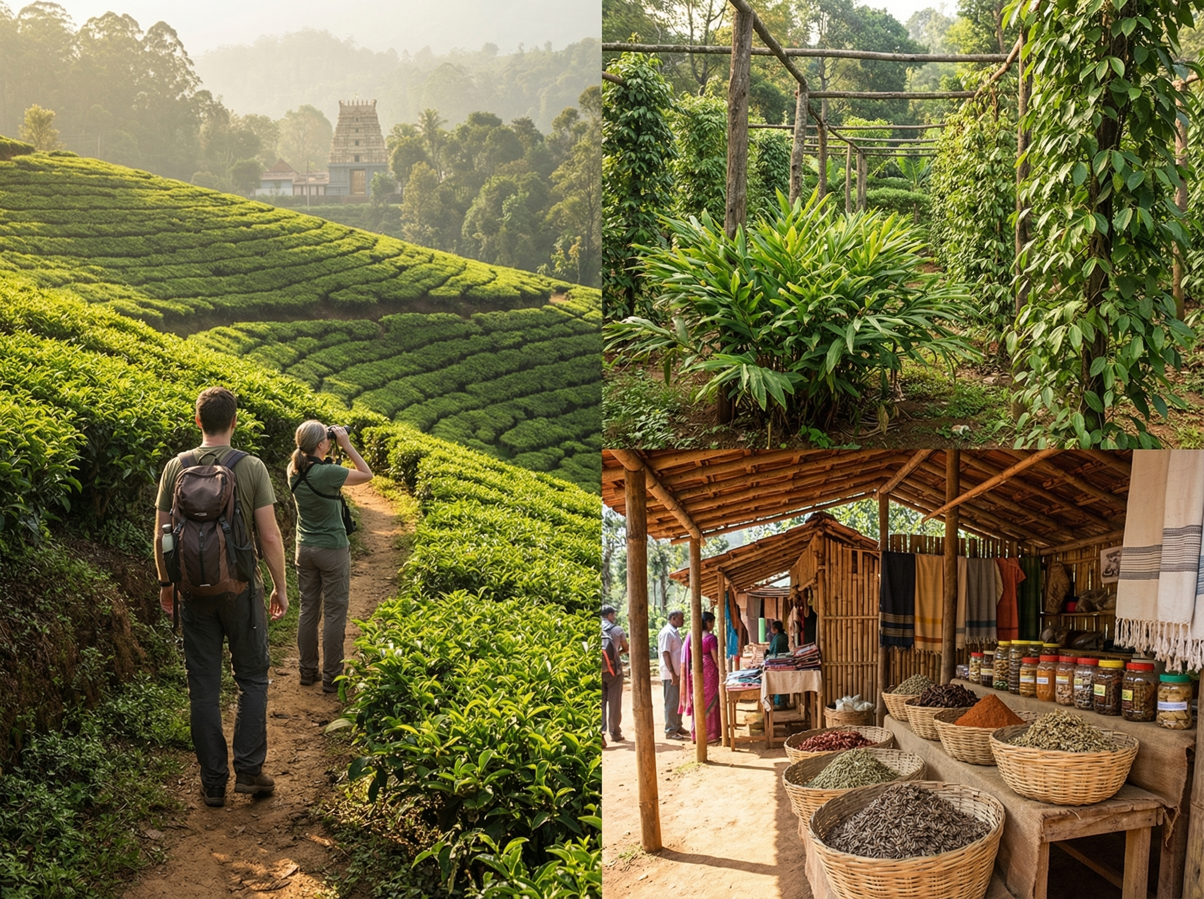 Bezoeken aan specerijentuinen bieden een geurige aanvulling op plattelandsbeleving, waar je leert over de teelt van kardemom, peper en kaneel en vaak kleine demonstraties van oogst en verwerking ziet. Lokale markten vormen een levendige kennismaking met regionale producten en ambachten; hier proef je verse snacks, koop je kruiden en praat je met producenten over hun producten. Culturele uitstapjes naar nabijgelegen dorpen en tempels geven inzicht in dagelijkse rituelen en gebruiken, en combineren gemakkelijk met plantagerondleidingen voor wie de sociale en spirituele context van het landschap wil ervaren.