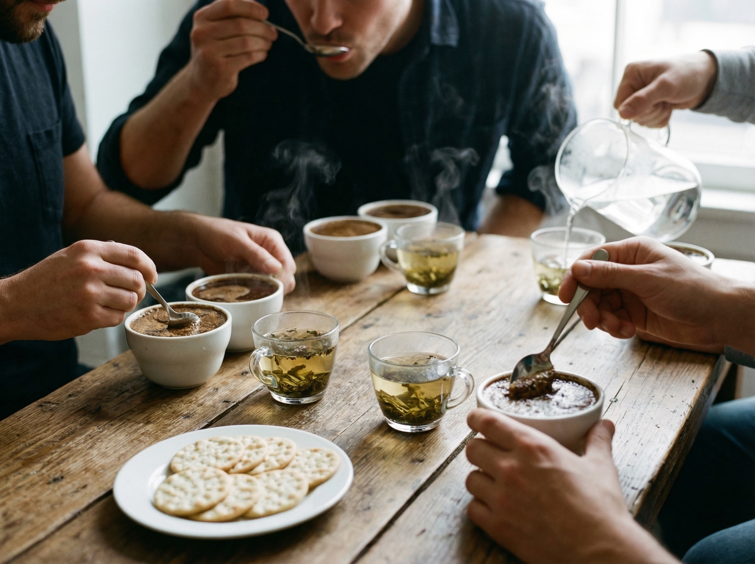 Cupping is de professionele smaaktest voor zowel thee als koffie: hete infusies worden systematisch geroken en geproefd om aroma, body, zuurgraad, bittere noten en nasmaak te beoordelen. Deze methode helpt producenten en kopers kwaliteit en karakter te vergelijken en is vaak onderdeel van rondleidingen en proeverijen zodat bezoekers het verschil kunnen leren herkennen.