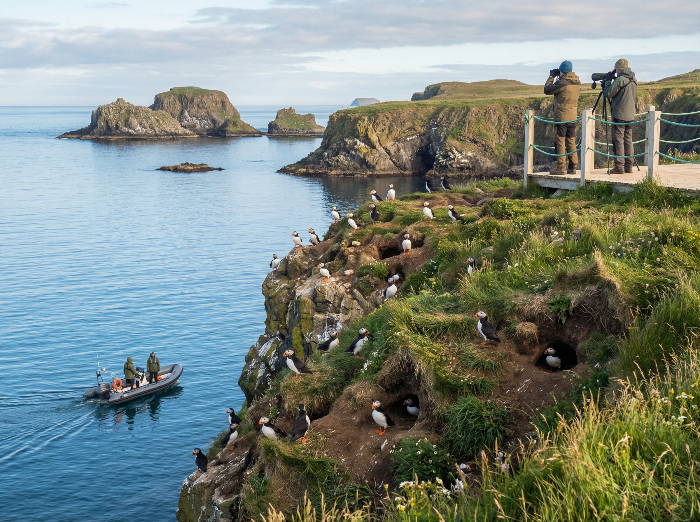 Een verrekijker of een telelens maakt het verschil bij het observeren van details zoals het felgekleurde snavelpatroon en het voertransport naar de nesten. Lichtomstandigheden spelen mee: zachte ochtend- of avondzon verbetert zichtbaarheid en fotografie, en rustige zeeën vergroten de kans op boottochten die dicht genoeg bij de kolonie komen zonder de gebruikelijke beperkingen voor aanlandingen te overschrijden.