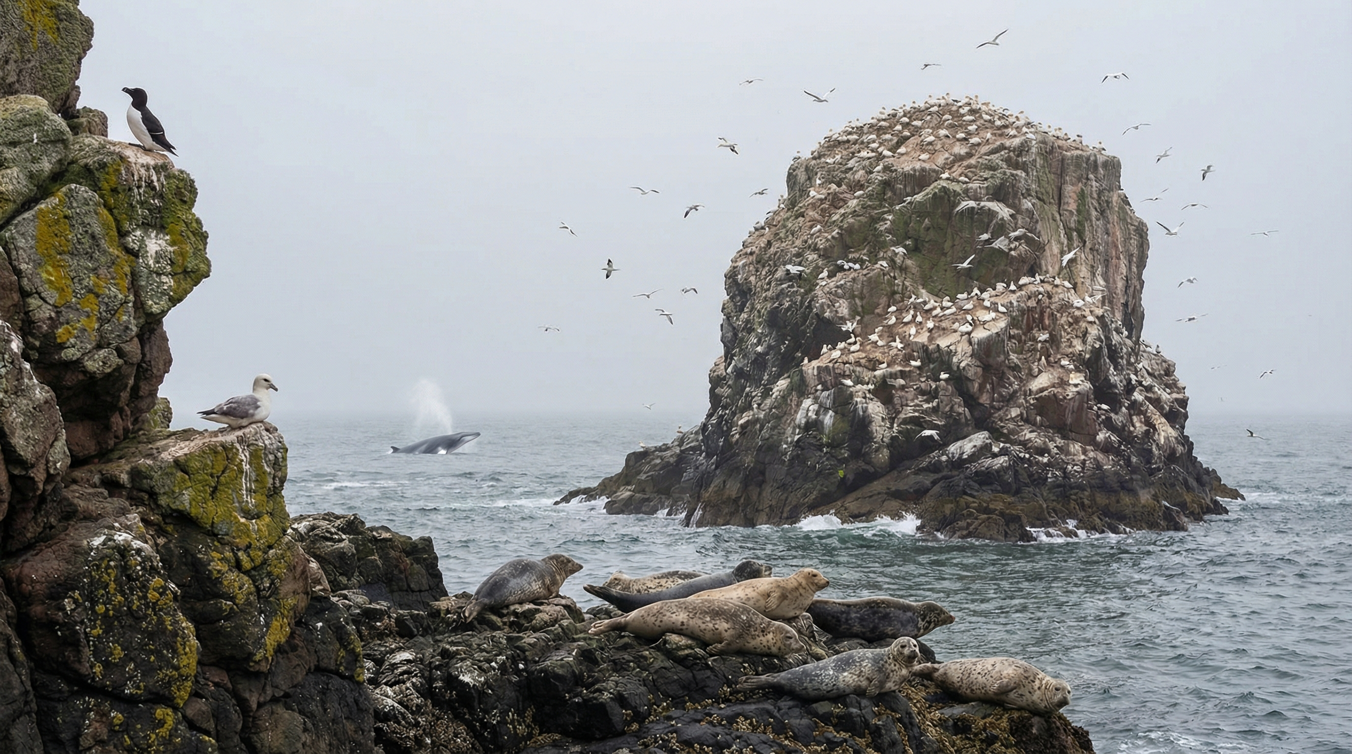Papegaaiduikers en andere zeevogels vinden op de geïsoleerde eilanden en steile kliffen ideale nestplaatsen. De combinatie van weinig terrestrische predatoren op afgelegen eilandjes en voldoende nestmateriaal in grasrichels of scheuren in de rots maakt deze plekken veilig voor jongen. Tegelijkertijd zorgen lokale voedselbronnen zoals scholen kleine vis en upwellingzones langs bepaalde stukken kust voor voldoende voedsel om broedsuccessen te ondersteunen. De cyclische bewegingen van visrijke wateren en de nabijheid van geschikte broedplaatsen verklaren waarom kolonies hier kunnen floreren, vaak zichtbaar vanaf veilige uitzichtpunten of per boot.