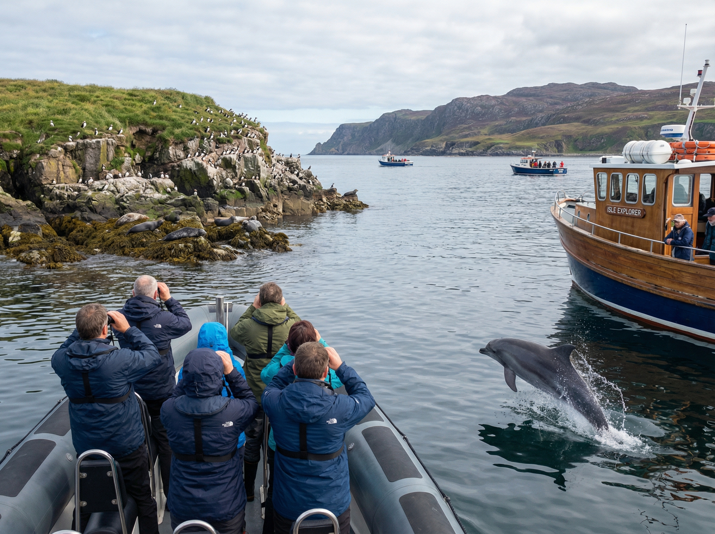 Voor dagtochten naar vogelkolonies is een van de meest bereikbare opties de Isle of May-dagtrip vanuit Anstruther: korte overtochten brengen je dicht bij de kliffen waar papegaaiduikers en andere zeevogels broeden, ideaal voor een halve tot hele dag. Vanaf Tobermory op Mull en vanuit Oban vertrekken regelmatig boottochten naar de Treshnish Isles, waarbij je niet alleen papegaaiduikers maar ook zeehonden en soms dolfijnen kunt zien terwijl je langs de laaggelegen, grasrijke eilanden vaart. In het noordoosten bieden Moray Firth-cruises vanuit Inverness of Cromarty uitstekende kansen voor tuimelaarwaarnemingen; deze tochten combineren kustkijken met mogelijkheden om grotere open wateren te verkennen waar dolfijnen vaak volgen op getijdenstromen.
