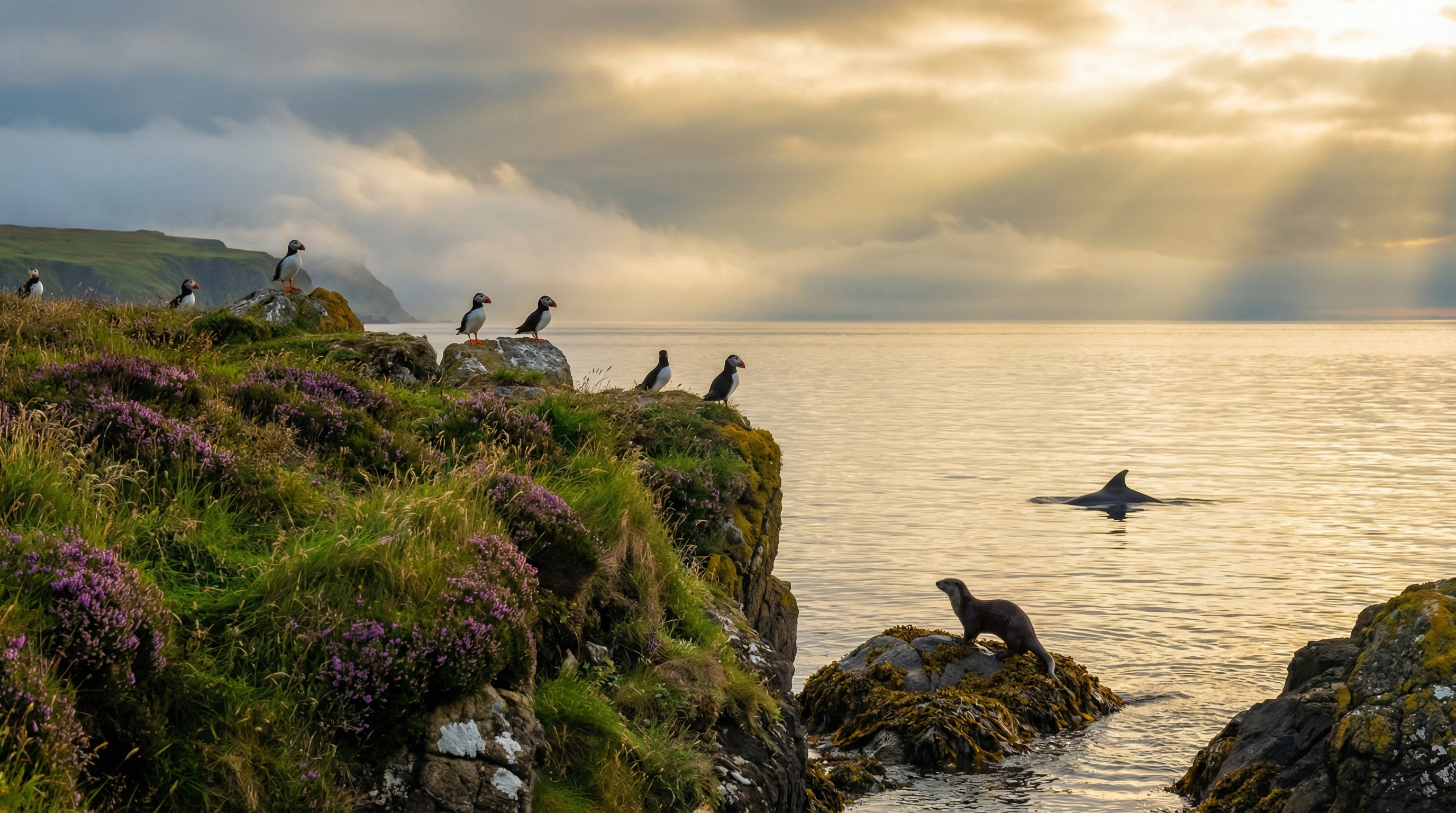 Voor papegaaiduikers is de beste periode duidelijk in de lente en het vroege voorjaar-naar-zomerseizoen, met mei en juni als piekmaanden wanneer kolonies druk zijn met broeden en het voeren van jongen. Dolfijnen verschijnen vaak het hele jaar door, maar hun activiteit en zichtbaarheid nemen toe in de warmere maanden wanneer voedselbronnen actiever zijn en meer boottochten plaatshebben. Otters zijn het hele jaar aanwezig langs veel kusten en lochs, maar je maakt de meeste kans tijdens de schemering en vroege ochtenduren wanneer ze het meest foerageren en zichtbaar zijn langs de waterlijn.