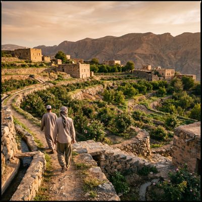 - Ochtend: Vroege start op de berg: klim of rijd naar hoge uitkijkpunten op het Al Jabal Al Akhdar plateau en kies tussen een stevige wandeling over het Saiq Plateau met vergezichten en rotsformaties, of een rustige dorpswandeling door terrassen vol steenfruit en rozen. Wie wil kan een lokale gids meenemen om meer te leren over de traditionele falaj-waterlopen en de landbouw; populair is een georganiseerde optie zoals de Jebel Akhdar guided hike die routes, veiligheid en lokale verhalen combineert. Liever ontspannen? Blijf bij je hotel en geniet van het landschap vanaf het terras met een sterke Omani-koffie.