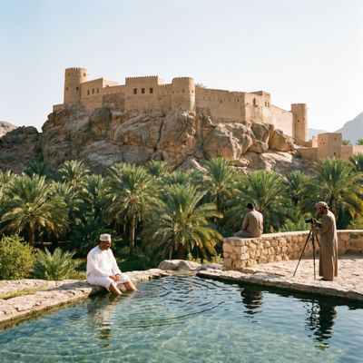 - Ochtend: Pak je spullen en rijd rustig van de hoge plateau-wereld naar lager gelegen landschappen; stop bij het imposante Nakhl Fort om stenen torens en palmentuinen te verkennen en te klimmen voor uitzicht, of kies voor ontspanning bij de warmwaterbronnen van Ain Al Thowarah en dompel je voeten in het mineralige water. Als je zekerheid wilt, boek je een lokale gids of een begeleide tour zodat vervoer, toelating en verhalen over de fortgeschiedenis geregeld zijn.