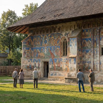 - Ochtend: Vroeg vertrek uit Sighetu Marmației richting de kleurrijke kloosters van Bucovina; je kunt rechtstreeks naar het beroemde Voroneț Monastery rijden om de iconische azuurblauwe frescos te zien en daar een georganiseerde excursie zoals de Bucovina painted monasteries tour te kiezen voor volledige context, of juist rustig starten met koffie en marktjes in Gura Humorului en daarna zelfstandig langs kleinere, minder drukke kloosters rijden. Wie van fotostops houdt plant tussen de kloosters door korte stops bij dorpjes om houtbewerking en lokale marktkramen te vangen, terwijl reizigers die comfort zoeken tours prefereren die vervoer en toelichting regelen.
