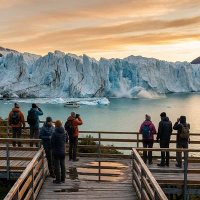 - Middag: In de middag rijd je richting het spectaculaire Perito Moreno Glacier waar de houten loopbruggen en uitkijkpunten enorme fotokansen geven; je kunt rustig de balkons aflopen en ijsmassa's zien kraken, of je kiest voor een boottocht die je terugslaat tegen de kolkende gletsjerwand via een Perito Moreno boat tour. Voor wie actie wil is er de kans om op het ijs te lopen met een gids — boek bijvoorbeeld een Perito Moreno mini-trek en voel het kraken onder je voeten. Als je liever niet al te nat wordt kun je ook een langere wandelroute langs de zuidelijke balkons kiezen en kijken naar afbrekende ijsbergen.
