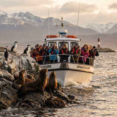 - Middag: Voor de middag kun je diep de Vuurland-wildernis in trekken en de kustpaden en meren van Tierra del Fuego National Park verkennen, met stops bij bezienswaardige uitkijkpunten en eventueel een kano op Lago Roca; wie meer fauna wil zien pakt een georganiseerde rit en boot naar het natuurreservaat en Isla Martillo voor pinguïnwaarneming via een Isla Martillo penguin tour. Blijf je in het dorp dan bezoek je het Maritiem Museum en het Museo del Fin del Mundo, of je boekt een langere Beagle Channel-excursie om zeeleeuwen en zeevogels van dichtbij te zien.