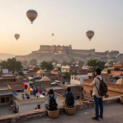 - Ochtend: Vroeg op pad kun je de dag beginnen met een spectaculaire rit in een heteluchtballon boven de roze stad via Hot Air Balloon Ride Jaipur, perfect voor zonsopgangfoto's en rustige panoramische uitzichten. Liever aarde onder je voeten? Bezoek dan het vredige Galta Ji (Monkey Temple) voordat de drukte begint en laat je verrassen door oude ghats en nieuwsgierige makaken. Een andere rustige optie is een bezoek aan het stapelbare Panna Meena Ka Kund en een korte workshop in blokdrukken met een lokale ambachtsman via Block Printing Workshop Jaipur, zodat je direct een uniek souvenir maakt.