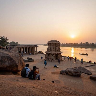 - Avond: Als de hitte zakt is nergens de zonsondergang zo episch als vanaf Matanga Hill of Hemakuta Hill; kies of je de klim maakt voor een panoramisch uitzicht en stilte, of rustig aanschuift bij een rooftop in Hampi Bazaar voor een diner met lokale gerechten en reizigersverhalen. Voor wie liever een alternatieve vibe zoekt, sluit je aan bij een riverside camp voor een kampvuur, livemuziek en sterrenkijken of blijf je vroeg terug in je hotel om foto's te sorteren en op te laden voor morgen. Het nachtleven is basic maar gezellig; er zijn paar backpacker-bars en informele jamsessies waar plannen voor de volgende dag ontstaan.