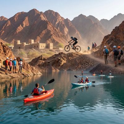 - Ochtend: Vroege start richting de bergen: rijd of boek een transfer naar Hatta en kies of je de dag begint met mountainbiken over de rode tracks en kuilen voor adrenaline, of dat je een stevige hike doet naar een uitzichtpunt in de Hajar Mountains voor epische foto’s. Als alternatief kun je ontspannen met een rustig ontbijt bij het water en alvast je kajaksessie plannen; voor georganiseerde opties kun je vooraf iets regelen via Hatta Full-Day Adventure with Kayak and Mountain Bike.