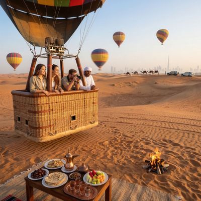 - Ochtend: Vroeg opstaan voor een spectaculaire zonsopgang boven de woestijn rondom Dubai met een heteluchtballonervaring en ontbijt, vaak aangeboden als georganiseerde trip zoals Dubai Hot Air Balloon with Breakfast; als je de stad liever van boven ziet kun je kiezen voor een helikopter- of watervliegtuigvlucht om de Palm en Downtown te overzien via een Dubai Helicopter Tour. Liever low-key? Blijf in je hotel voor een luxe spaontbijt of doe een rustige strandwandeling bij Jumeirah Beach, perfect om bij te komen en foto's te maken.