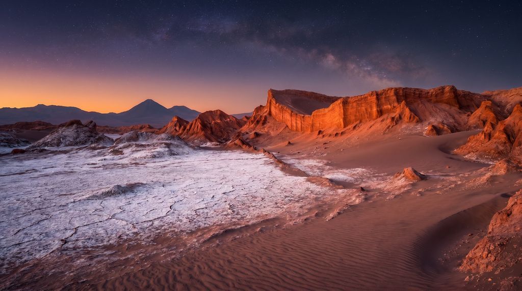 Voor liefhebbers van natuur en fotografie is dit een onuitputtelijke speeltuin. Het licht verandert per uur en tovert steeds nieuwe paletten over rotsformaties, kloven en zoutlagunes. Tijdens het gouden uur gloeien de bergen, midden op de dag schittert het zout verblindend, en bij zonsondergang worden valleien paars en karmijn. Zodra de nacht valt, ontvouwt zich een kristalheldere sterrenhemel met een diepte die je zelden ziet. Het ontbreken van licht- en vochtvervuiling maakt de Atacama-woestijn tot een internationale hotspot voor sterrenkijken: de Melkweg loopt als een zilveren rivier over je heen, en zelfs met het blote oog zie je details die elders telescopen vereisen.