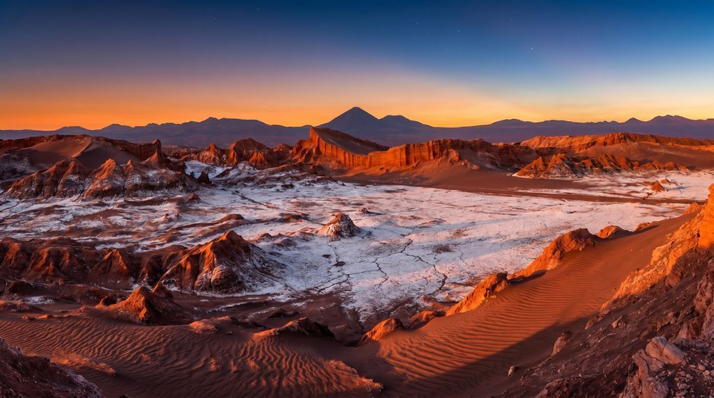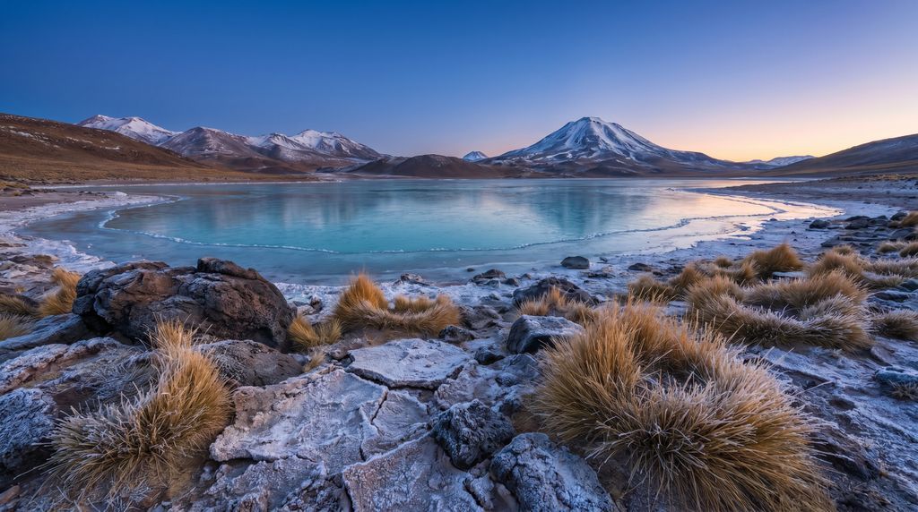 De Atacama-woestijn nestelt zich in je geheugen met een stilte die bijna tastbaar is en een hemel die dieper lijkt dan waar ook. Zoutvlaktes glanzen als gebroken spiegels, vulkaankegels tekenen scherpe profielen, en elke dag schuift een nieuw palet over rotsen en duinen: van koper en oker naar violet en indigo. In die helderheid worden schaduwen lang en details messcherp; je hoort het zachte ritselen van wind over zout, de kraak van droge aarde, het sissen van geisers bij dageraad. Het is een landschap dat je vertraagt én verscherpt.