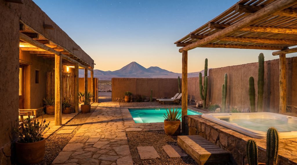 Aan de bovenkant van het spectrum liggen luxe lodges, vaak net buiten het centrum voor rust en ruimte. Veel van deze adressen werken op een alles-inclusief formule: volpension, open bar (soms), zwembad, spa en een excursieprogramma met professionele gidsen en flexibele dagindelingen. Transfers van en naar Calama zijn geregeld, en er is vaak een eigen astronomiedek of telescoop. Verwacht ruime kamers met airco of efficiënte ventilatie, goede verwarming voor koude nachten, en vroege ontbijtboxen voor wie richting El Tatio vertrekt. Dit is ideaal voor reizigers die comfort, logistiek gemak en topbegeleiding willen combineren.