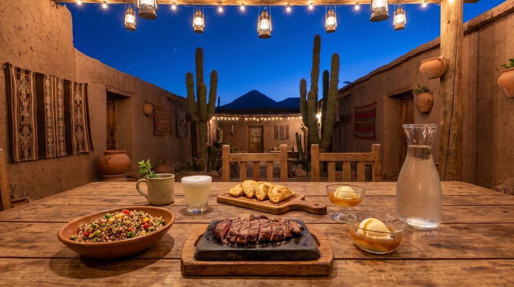San Pedro de Atacama verrast met een keuken waarin Andes-ingrediënten de hoofdrol spelen. Quinoa verschijnt in romige risotto’s, knapperige salades en stevige soepen die energie geven zonder te verzwaren. Chañar – de zoetige vrucht van de lokale boom – vind je als siroop over pannenkoeken, in roomijs of verwerkt in nagerechten met noten. De aromatische woestijnkruidige toets komt van rica-rica: een frisse, muntachtige plant die chefs gebruiken in marinades, oliën en infusies. Vleeseters proeven lama- of alpacavlees, vaak gegrild of gestoofd; het is mager, smaakvol en past bij aardse bijgerechten als geroosterde maïs, quinoa en andijvigeens. Vegetariërs en vegans vinden moeiteloos gerechten met peulvruchten, geroosterde groenten en Andessmaken.