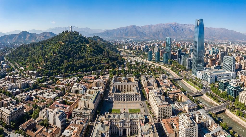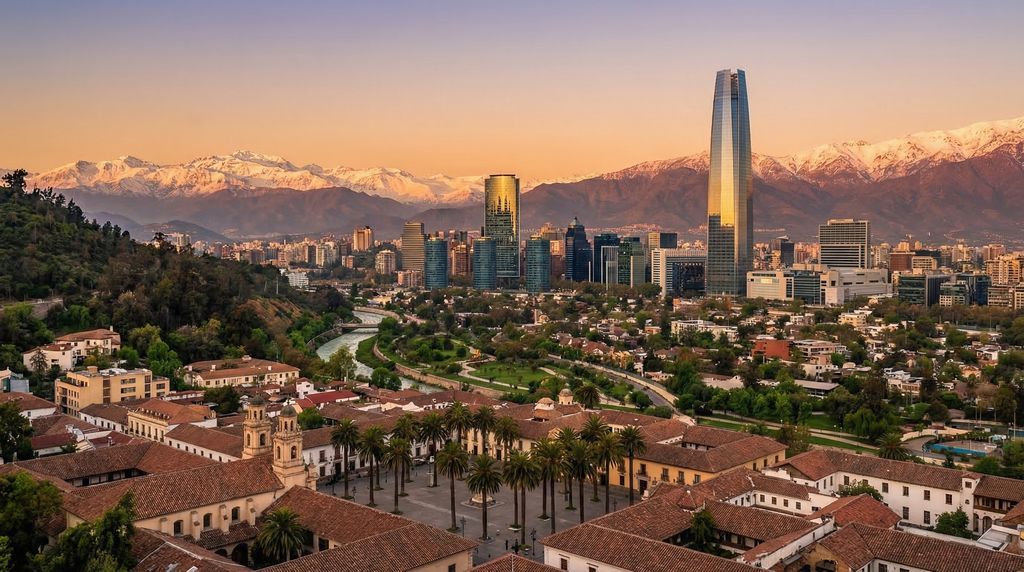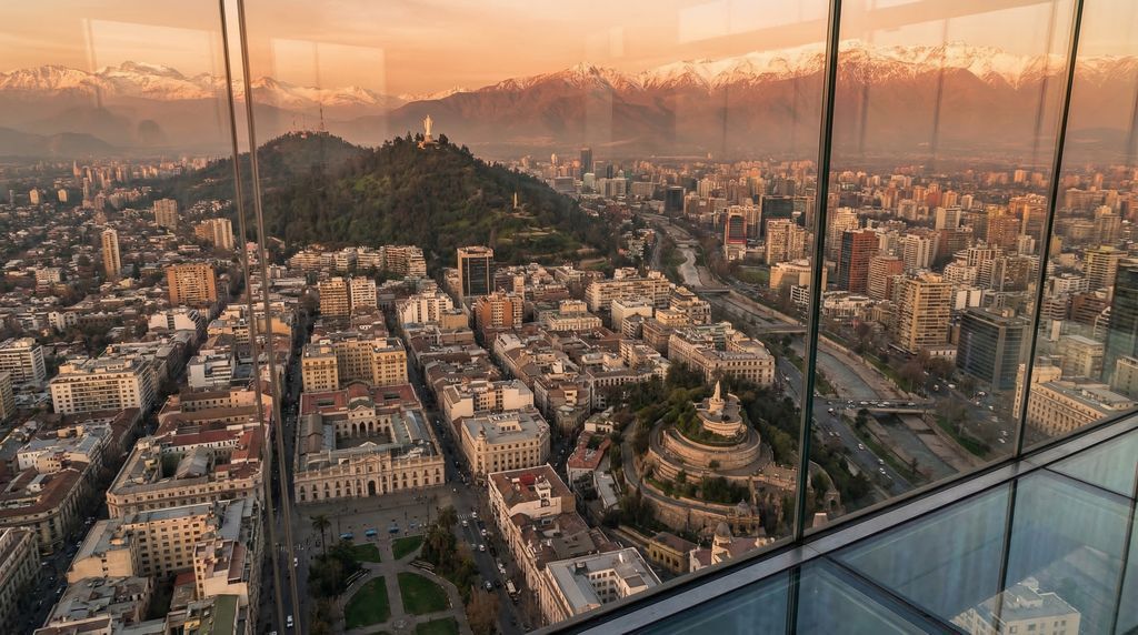 Santiago ontvouwt zich in de brede Centrale Vallei van Chili, een natuurlijke kom die ingesloten ligt tussen de besneeuwde Andes in het oosten en het lagere Kustgebergte in het westen. Door de stad stroomt de Mapocho-rivier, terwijl heuvels als Cerro San Cristóbal en Cerro Santa Lucía als herkenningspunten boven de wijken uitsteken. De ligging maakt dat het licht scherp kan contrasteren: op heldere dagen tekenen de Andes zich kristalhelder af achter glasgevels en kerktorens, terwijl in de avond de skyline gloedvol oplicht boven de vallei. Dit landschap bepaalt niet alleen de uitzichten, maar ook het ritme van de stad: van zaterdagochtenden op de markten tot zonsondergangen op de miradores.