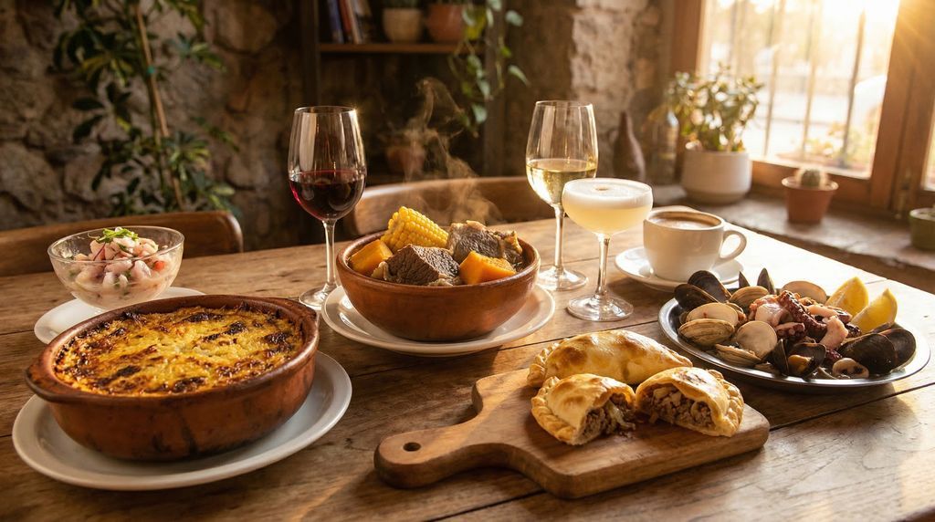 Santiago verleidt met gerechten die stevige huiselijkheid combineren met frisse kustsmaken. Pastel de choclo – een ovenschotel met zoete maïsdeeg, gekruid gehakt, kip, olijven en een vleugje suiker – vertegenwoordigt de Chileense comfortkeuken. Empanadas verschijnen op elke straathoek, van gebakken of ovenvarianten met pino (rundvlees, ui, rozijnen, olijf, ei) tot kaas- en marisco-vullingen. Cazuela is de dampende klassieker voor frisse dagen: een heldere bouillon met rund of kip, maïskolf, pompoen en aardappel. Langs de kustlijn levert Chili een rijkdom aan mariscos: schelpdieren, krab, inktvis en vissoorten die hun weg vinden naar caldillo, ceviche of eenvoudige grillgerechten met citroen en ají.