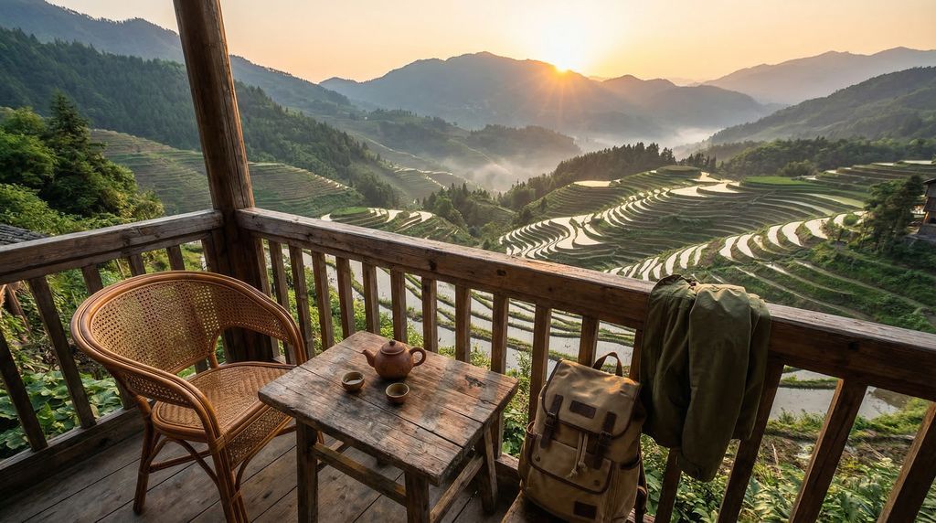 Voor een nacht dicht bij de iconische panorama’s ga je naar de Longji‑rijstterrassen. Overnachten kan in Ping’an (compact, Zhuang‑dorpen, korte wandelingen naar “Seven Stars with Moon” en “Nine Dragons & Five Tigers”) of in Dazhai/Jinkeng (Yao‑dorpen, langere trails en een kabelbaan die snel hoogte geeft). Kies bij voorkeur een kamer met balkon of expliciet “bergzicht”; houten paalwoningen hebben vaak knusse kamers met veel sfeer. Reis licht: laat grote koffers achter in Guilin of Yangshuo en neem een daypack mee; steegjes zijn smal en bestaan uit trappen. Bagagedragers zijn ter plekke te regelen. In de winter zijn elektrische dekens of airco‑verwarming geen luxe, in de zomer is een ventilator of airco prettig na wandelingen.