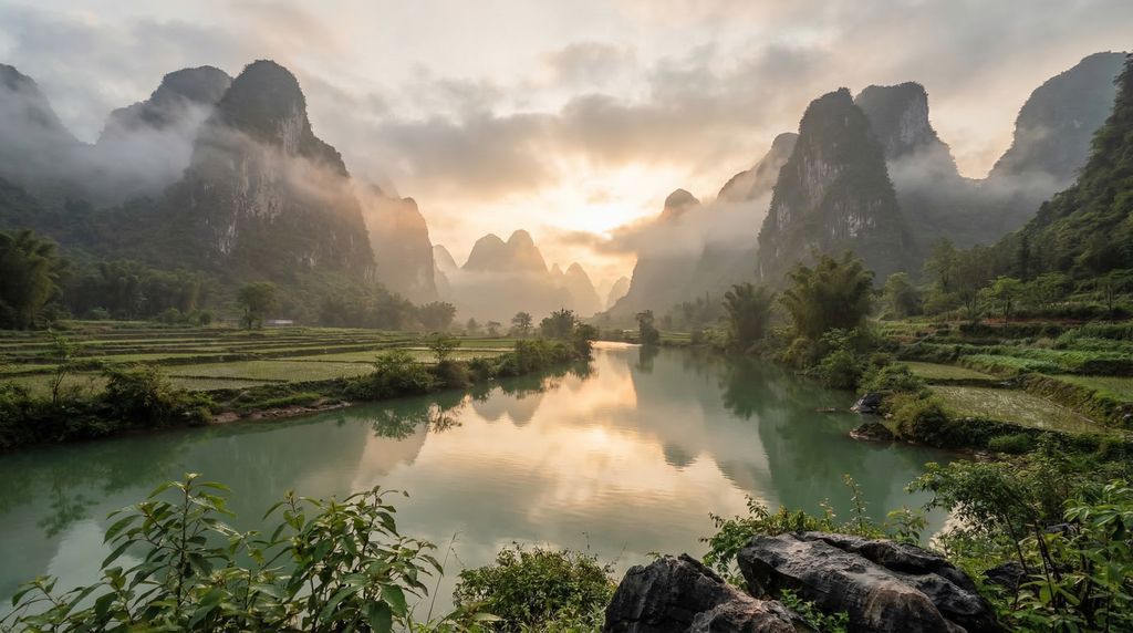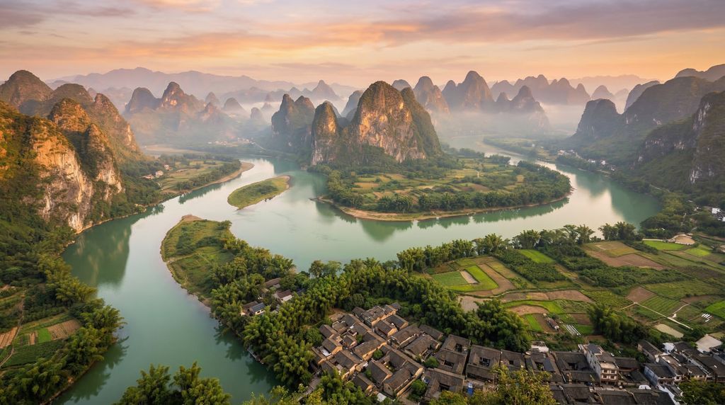 Tussen de kalkstenen karstpieken en de kronkelende Li-rivier ontvouwt zich het landschap van Guilin, een van China’s meest schilderachtige regio’s. Ochtendnevel hangt boven spiegelende meren, vissers glijden voorbij op bamboevlotten en terrasvormige rijstvelden kleuren met de seizoenen mee. In deze stad en haar groene omgeving komen eeuwenoude tradities samen met relaxte dorpssfeer — ideaal voor wie stilte, vergezichten en authentieke Chinese charme zoekt.