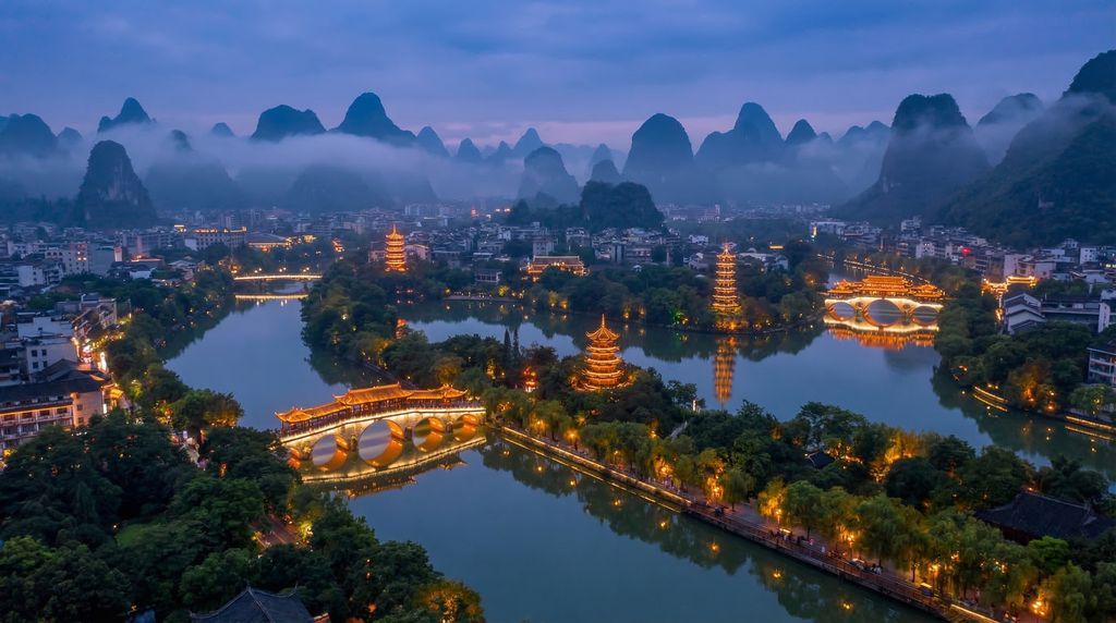 In en rond Guilin‑stad liggen de bekendste stedelijke bezienswaardigheden geconcentreerd. Tussen de meren Rong en Shan en het ‘Two Rivers & Four Lakes’-gebied vind je promenades, verlichte bruggen en aanlegsteigers voor avondboottochten. Heuvels als Elephant Trunk Hill, Fubo Hill en Diecai Hill bieden panoramische uitzichten, terwijl parken en musea context geven over geologie, lokale kunst en volkscultuur. Net buiten het centrum lonkt de Rietfluitgrot met kleurrijk verlichte zalen en kalksteenformaties. De afstanden zijn compact: veel plekken bereik je per taxi of fiets binnen 10–20 minuten.