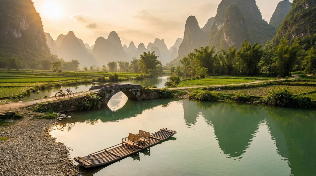 Guilin blijft hangen als een droombeeld waarin natuur en dorpsleven naadloos in elkaar overvloeien. Sprookjesachtige karstpieken steken op uit het landschap als wachters van steen, kalme rivieren spiegelen de lucht en in de dalen liggen dorpjes waar de tijd traag lijkt te lopen. De nevel van de vroege ochtend, het fluweelzachte licht tegen de avond en de schaduwen die over terrasvormige rijstvelden schuiven: het is die zintuiglijke gelaagdheid die elke blik verandert in een herinnering. Hier voelt zelfs een eenvoudige wandeling langs een oever als een scène uit een schilderij.